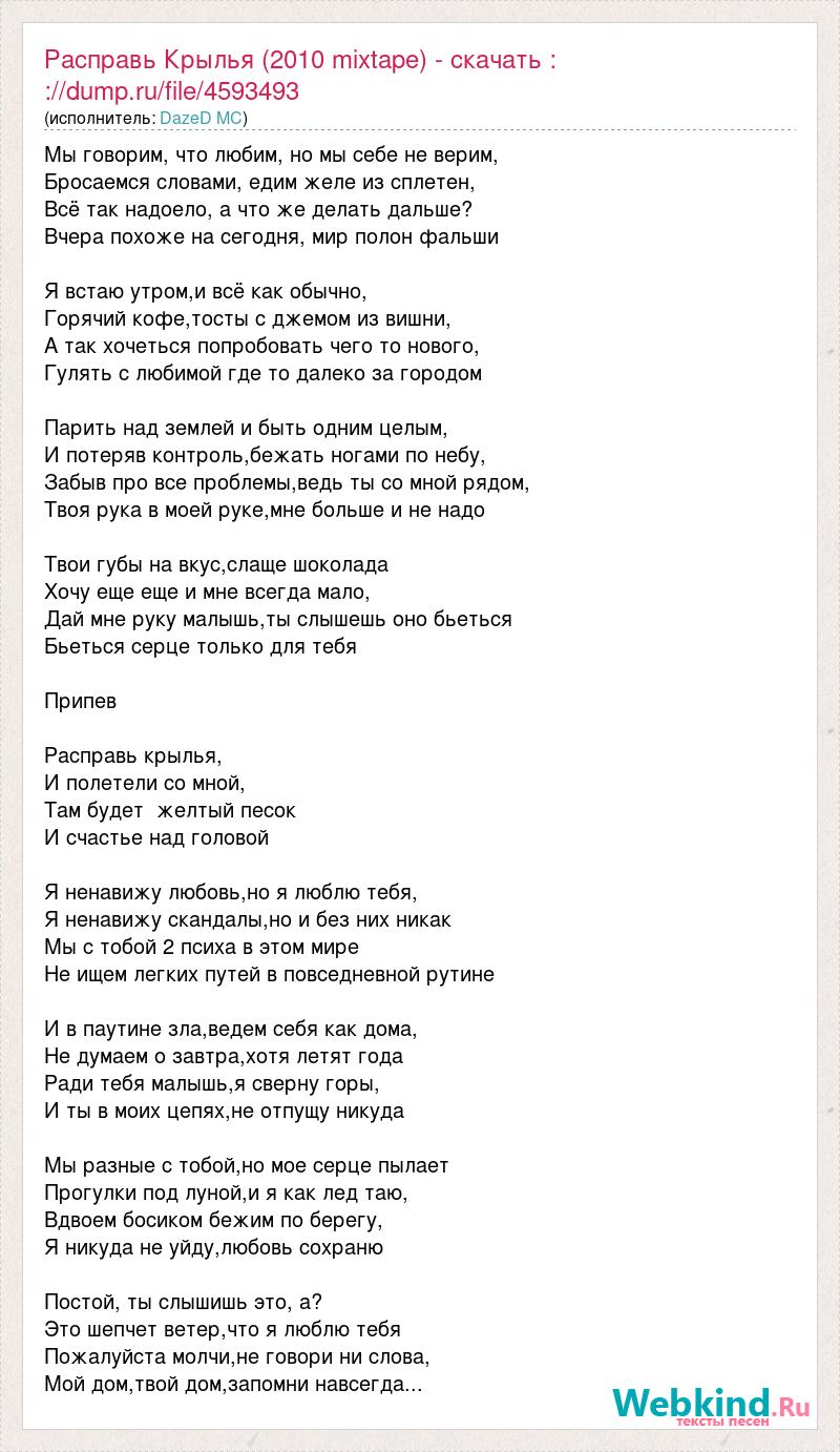 Мы говорим, что любим, но мы себе не верим, Бросаемся словами, едим желе из сплетен, Всё так надоело, а что же делать дальше? Вчера похоже на сегодня, мир полон фальши Я встаю утром,и всё как обычно, Горячий кофе,тосты с джемом из вишни, А так хочеться попробовать чего то нового, Гулять с любимой где то далеко за городом Парить над землей и быть одним целым, И потеряв контроль,бежать ногами по небу, Забыв про все проблемы,ведь ты со мной рядом, Твоя рука в моей руке,мне больше и не надо Твои губы на вкус,слаще шоколада Хочу еще еще и мне всегда мало, Дай мне руку малышь,ты слышешь оно бьеться Бьеться серце только для тебя Припев Расправь крылья, И полетели со мной, Там будет желтый песок И счастье над головой Я ненавижу любовь,но я люблю тебя, Я ненавижу скандалы,но и без них никак Мы с тобой 2 психа в этом мире Не ищем легких путей в повседневной рутине И в паутине зла,ведем себя как дома, Не думаем о завтра,хотя летят года Ради тебя малышь,я сверну горы, И ты в моих цепях,не отпущу никуда Мы разные с тобой,но мое серце пылает Прогулки под луной,и я как лед таю, Вдвоем босиком бежим по берегу, Я никуда не уйду,любовь сохраню Постой, ты слышишь это, а? Это шепчет ветер,что я люблю тебя Пожалуйста молчи,не говори ни слова, Мой дом,твой дом,запомни навсегда...
