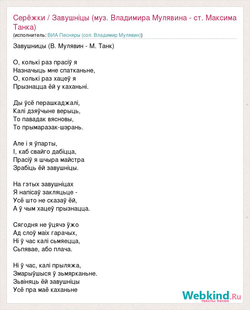 Завушницы (В. Мулявин - М. Танк) О, колькі раз прасіў я Назначыць мне спатканьне, О, колькі раз хацеў я Прызнацца ёй у каханьні. Ды ўсё перашкаджалі, Калі дзяўчыне верыць, То павадак вясновы, То прымаразак-шэрань. Але і я ўпарты, І, каб свайго дабіцца, Прасіў я шчыра майстра Зрабіць ёй завушніцы. На гэтых завушніцах Я напісаў закляцьце - Усё што не сказаў ёй, А ў чым хацеў прызнацца. Сягодня не ўцячэ ўжо Ад слоў маіх гарачых, Ні ў час калі сьмяецца, Сьпявае, або плача. Ні ў час, калі прыляжа, Змарыўшыся ў зьмярканьне. Зьвіняць ёй завушніцы Усё пра маё каханьне
