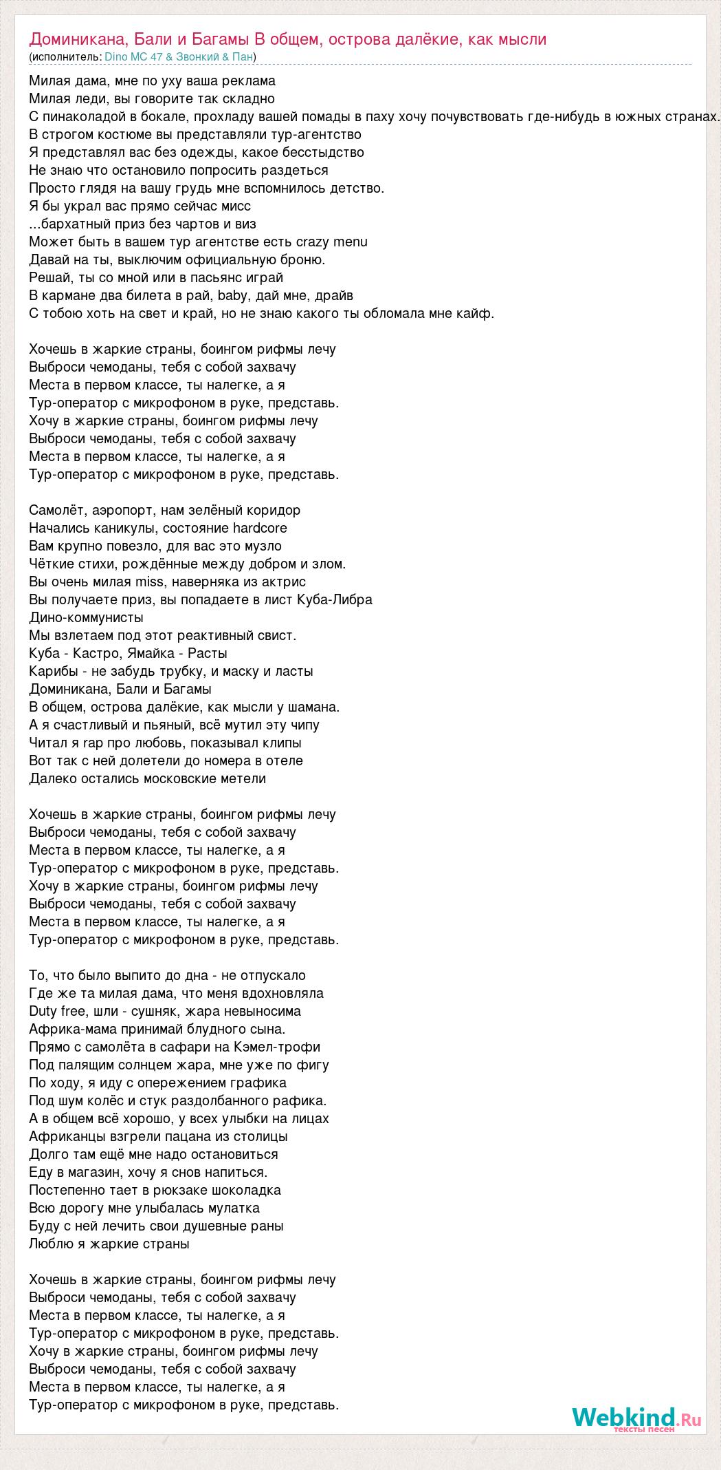 Милая дама, мне по уху ваша реклама Милая леди, вы говорите так складно С пинаколадой в бокале, прохладу вашей помады в паху хочу почувствовать где-нибудь в южных странах. В строгом костюме вы представляли тур-агентство Я представлял вас без одежды, какое бесстыдство Не знаю что остановило попросить раздеться Просто глядя на вашу грудь мне вспомнилось детство. Я бы украл вас прямо сейчас мисс ...бархатный приз без чартов и виз Может быть в вашем тур агентстве есть crazy menu Давай на ты, выключим официальную броню. Решай, ты со мной или в пасьянс играй В кармане два билета в рай, baby, дай мне, драйв С тобою хоть на свет и край, но не знаю какого ты обломала мне кайф. Хочешь в жаркие страны, боингом рифмы лечу Выброси чемоданы, тебя с собой захвачу Места в первом классе, ты налегке, а я Тур-оператор с микрофоном в руке, представь. Хочу в жаркие страны, боингом рифмы лечу Выброси чемоданы, тебя с собой захвачу Места в первом классе, ты налегке, а я Тур-оператор с микрофоном в руке, представь. Самолёт, аэропорт, нам зелёный коридор Начались каникулы, состояние hardcore Вам крупно повезло, для вас это музло Чёткие стихи, рождённые между добром и злом. Вы очень милая miss, наверняка из актрис Вы получаете приз, вы попадаете в лист Куба-Либра Дино-коммунисты Мы взлетаем под этот реактивный свист. Куба - Кастро, Ямайка - Расты Карибы - не забудь трубку, и маску и ласты Доминикана, Бали и Багамы В общем, острова далёкие, как мысли у шамана. А я счастливый и пьяный, всё мутил эту чипу Читал я rap про любовь, показывал клипы Вот так с ней долетели до номера в отеле Далеко остались московские метели Хочешь в жаркие страны, боингом рифмы лечу Выброси чемоданы, тебя с собой захвачу Места в первом классе, ты налегке, а я Тур-оператор с микрофоном в руке, представь. Хочу в жаркие страны, боингом рифмы лечу Выброси чемоданы, тебя с собой захвачу Места в первом классе, ты налегке, а я Тур-оператор с микрофоном в руке, представь. То, что было выпито до дна - не отпускало Где же та милая дама, что меня вдохновляла Duty free, шли - сушняк, жара невыносима Африка-мама принимай блудного сына. Прямо с самолёта в сафари на Кэмел-трофи Под палящим солнцем жара, мне уже по фигу По ходу, я иду с опережением графика Под шум колёс и стук раздолбанного рафика. А в общем всё хорошо, у всех улыбки на лицах Африканцы взгрели пацана из столицы Долго там ещё мне надо остановиться Еду в магазин, хочу я снов напиться. Постепенно тает в рюкзаке шоколадка Всю дорогу мне улыбалась мулатка Буду с ней лечить свои душевные раны Люблю я жаркие страны Хочешь в жаркие страны, боингом рифмы лечу Выброси чемоданы, тебя с собой захвачу Места в первом классе, ты налегке, а я Тур-оператор с микрофоном в руке, представь. Хочу в жаркие страны, боингом рифмы лечу Выброси чемоданы, тебя с собой захвачу Места в первом классе, ты налегке, а я Тур-оператор с микрофоном в руке, представь.