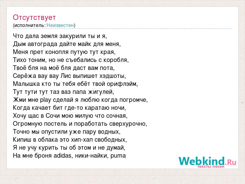 Что дала земля закурили ты и я, Дым автограда дайте майк для меня, Меня прет конопля путую тут края, Тихо тоним, но не съебались с коробля, Твоё бля на моё бля даст вам пота, Серёжа вау вау Лис выпишет хэдшоты, Малышка кто ты тебя ебёт твой орифлэйм, Тут тути тут таз ваз папа жигулей, Жми мне play сделай я люблю когда погромче, Когда качает бит где-то каратаю ночи, Хочу щас в Сочи мою милую что сочная, Огромную постель и поработать сверхурочно, Точно мы опустили уже пару водных, Кипиш в облака это хип-хап свободных, Я не учу курить ты об этом и не думай, На мне броня adidas, ники-найки, puma