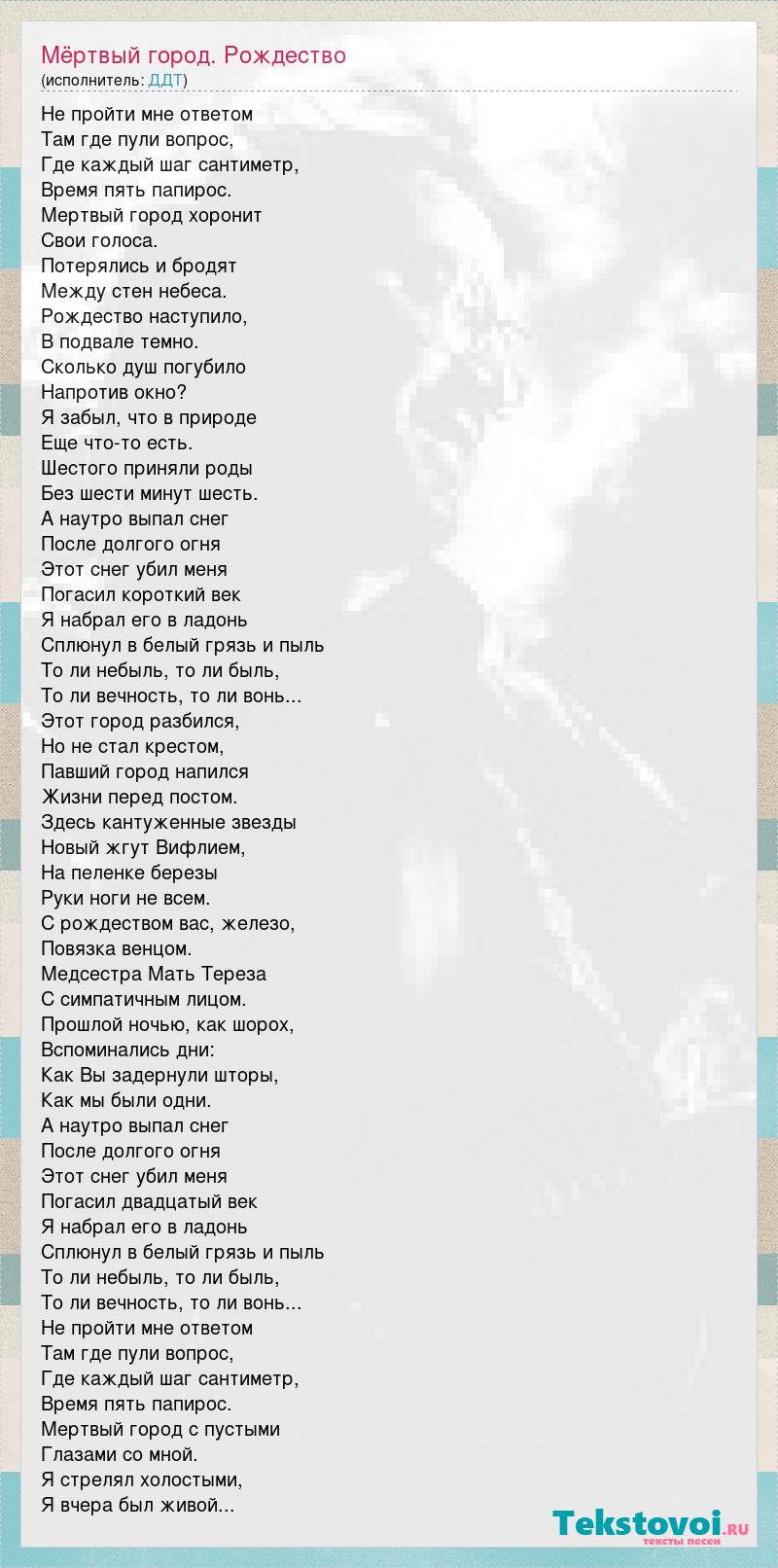 Не пройти мне ответом Там где пули вопрос, Где каждый шаг сантиметр, Время пять папирос. Мертвый город хоронит Свои голоса. Потерялись и бродят Между стен небеса. Рождество наступило, В подвале темно. Сколько душ погубило Напротив окно? Я забыл, что в природе Еще что-то есть. Шестого приняли роды Без шести минут шесть. А наутро выпал снег После долгого огня Этот снег убил меня Погасил короткий век Я набрал его в ладонь Сплюнул в белый грязь и пыль То ли небыль, то ли быль, То ли вечность, то ли вонь... Этот город разбился, Но не стал крестом, Павший город напился Жизни перед постом. Здесь кантуженные звезды Новый жгут Вифлием, На пеленке березы Руки ноги не всем. С рождеством вас, железо, Повязка венцом. Медсестра Мать Тереза С симпатичным лицом. Прошлой ночью, как шорох, Вспоминались дни: Как Вы задернули шторы, Как мы были одни. А наутро выпал снег После долгого огня Этот снег убил меня Погасил двадцатый век Я набрал его в ладонь Сплюнул в белый грязь и пыль То ли небыль, то ли быль, То ли вечность, то ли вонь... Не пройти мне ответом Там где пули вопрос, Где каждый шаг сантиметр, Время пять папирос. Мертвый город с пустыми Глазами со мной. Я стрелял холостыми, Я вчера был живой...