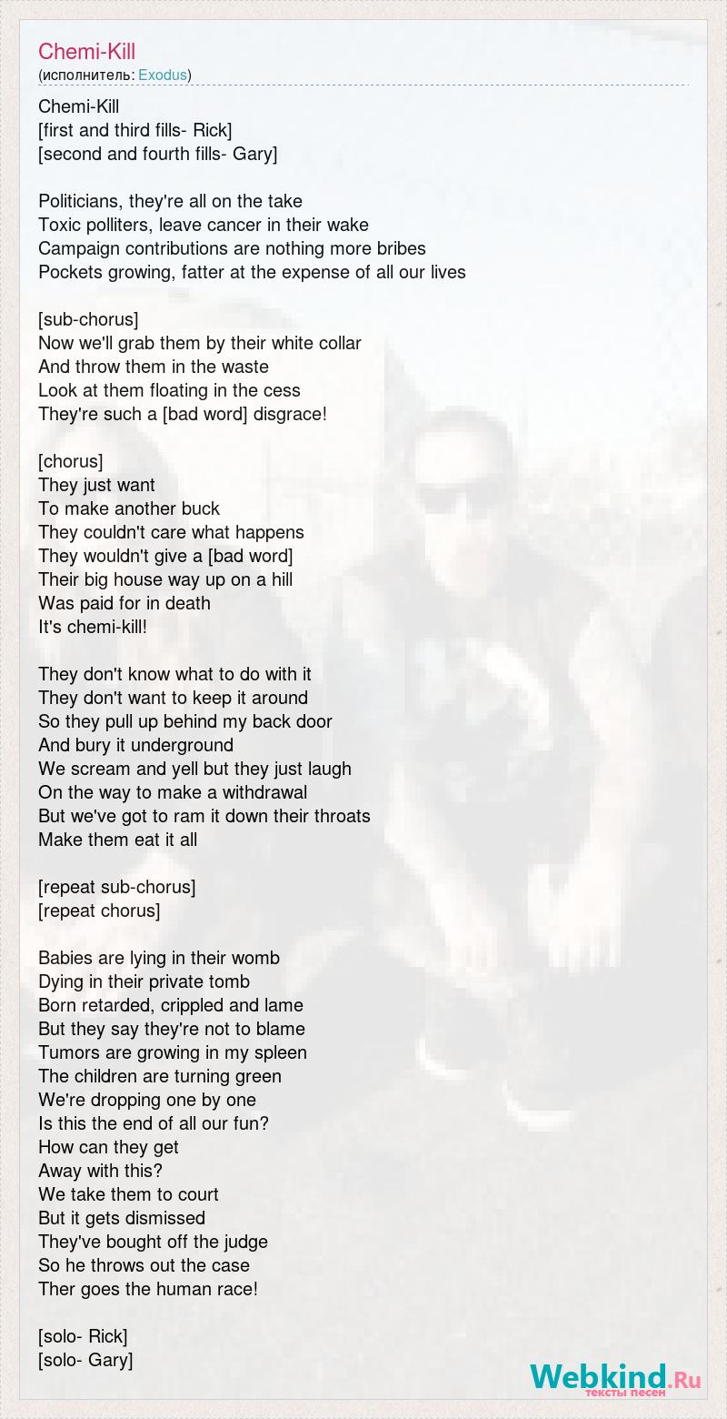 Chemi-Kill [first and third fills- Rick] [second and fourth fills- Gary] Politicians, they're all on the take Toxic polliters, leave cancer in their wake Campaign contributions are nothing more bribes Pockets growing, fatter at the expense of all our lives [sub-chorus] Now we'll grab them by their white collar And throw them in the waste Look at them floating in the cess They're such a [bad word] disgrace! [chorus] They just want To make another buck They couldn't care what happens They wouldn't give a [bad word] Their big house way up on a hill Was paid for in death It's chemi-kill! They don't know what to do with it They don't want to keep it around So they pull up behind my back door And bury it underground We scream and yell but they just laugh On the way to make a withdrawal But we've got to ram it down their throats Make them eat it all [repeat sub-chorus] [repeat chorus] Babies are lying in their womb Dying in their private tomb Born retarded, crippled and lame But they say they're not to blame Tumors are growing in my spleen The children are turning green We're dropping one by one Is this the end of all our fun? How can they get Away with this? We take them to court But it gets dismissed They've bought off the judge So he throws out the case Ther goes the human race! [solo- Rick] [solo- Gary]