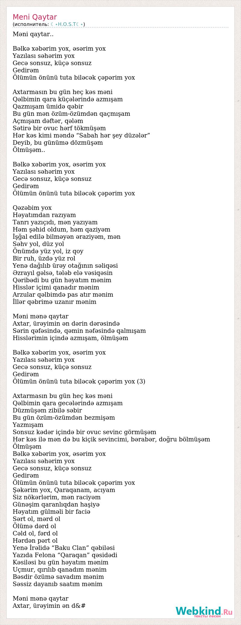 Məni qaytar.. Bəlkə xəbərim yox, əsərim yox Yazılası səhərim yox Gecə sonsuz, küçə sonsuz Gedirəm Ölümün önünü tuta biləcək çəpərim yox Axtarmasın bu gün heç kəs məni Qəlbimin qara küçələrində azmışam Qazmışam ümidə qəbir Bu gün mən özüm-özümdən qaçmışam Açmışam dəftər, qələm Sətirə bir ovuc hərf tökmüşəm Hər kəs kimi məndə “Sabah hər şey düzələr” Deyib, bu günümə dözmüşəm Ölmüşəm.. Bəlkə xəbərim yox, əsərim yox Yazılası səhərim yox Gecə sonsuz, küçə sonsuz Gedirəm Ölümün önünü tuta biləcək çəpərim yox Qəzəbim yox Həyatımdan razıyam Tanrı yazıçıdı, mən yazıyam Həm şəhid oldum, həm qaziyəm İşğal edilə bilməyən əraziyəm, mən Səhv yol, düz yol Önümdə yüz yol, iz qoy Bir ruh, üzdə yüz rol Yenə dağılıb ürəy otağının səliqəsi Əzrayıl gəlsə, tələb elə vəsiqəsin Qəribədi bu gün həyatım mənim Hisslər içimi qanadır mənim Arzular qəlbimdə pas atır mənim İllər qəbrimə uzanır mənim Məni mənə qaytar Axtar, ürəyimin ən dərin dərəsində Sərin qəfəsində, qəmin nəfəsində qalmışam Hisslərimin içində azmışam, ölmüşəm Bəlkə xəbərim yox, əsərim yox Yazılası səhərim yox Gecə sonsuz, küçə sonsuz Gedirəm Ölümün önünü tuta biləcək çəpərim yox (3) Axtarmasın bu gün heç kəs məni Qəlbimin qara gecələrində azmışam Düzmüşəm zibilə səbir Bu gün özüm-özümdən bezmişəm Yazmışam Sonsuz kədər içində bir ovuc sevinc görmüşəm Hər kəs ilə mən də bu kiçik sevincimi, bərabər, doğru bölmüşəm Ölmüşəm Bəlkə xəbərim yox, əsərim yox Yazılası səhərim yox Gecə sonsuz, küçə sonsuz Gedirəm Ölümün önünü tuta biləcək çəpərim yox Şəkərim yox, Qaraqanam, acıyam Siz nökərlərim, mən raciyəm Günəşim qaranlıqdan haşiyə Həyatım gülməli bir faciə Sərt ol, mərd ol Ölümə dərd ol Cəld ol, fərd ol Hərdən pərt ol Yenə İrəlidə “Baku Clan” qəbiləsi Yazıda Felona “Qaraqan” qəsidədi Kəsiləsi bu gün həyatım mənim Uçmur, qırılıb qanadım mənim Bəsdir özümə savadım mənim Səssiz dayanıb saatım mənim Məni mənə qaytar Axtar, ürəyimin ən d