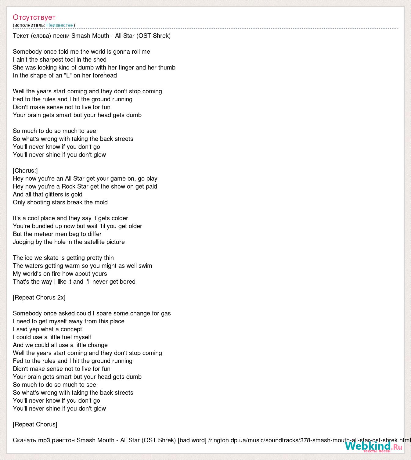 Текст (слова) песни Smash Mouth - All Star (OST Shrek) Somebody once told me the world is gonna roll me I ain't the sharpest tool in the shed She was looking kind of dumb with her finger and her thumb In the shape of an "L" on her forehead Well the years start coming and they don't stop coming Fed to the rules and I hit the ground running Didn't make sense not to live for fun Your brain gets smart but your head gets dumb So much to do so much to see So what's wrong with taking the back streets You'll never know if you don't go You'll never shine if you don't glow [Chorus:] Hey now you're an All Star get your game on, go play Hey now you're a Rock Star get the show on get paid And all that glitters is gold Only shooting stars break the mold It's a cool place and they say it gets colder You're bundled up now but wait 'til you get older But the meteor men beg to differ Judging by the hole in the satellite picture The ice we skate is getting pretty thin The waters getting warm so you might as well swim My world's on fire how about yours That's the way I like it and I'll never get bored [Repeat Chorus 2x] Somebody once asked could I spare some change for gas I need to get myself away from this place I said yep what a concept I could use a little fuel myself And we could all use a little change Well the years start coming and they don't stop coming Fed to the rules and I hit the ground running Didn't make sense not to live for fun Your brain gets smart but your head gets dumb So much to do so much to see So what's wrong with taking the back streets You'll never know if you don't go You'll never shine if you don't glow [Repeat Chorus] Скачать mp3 рингтон Smash Mouth - All Star (OST Shrek) [bad word] /rington.dp.ua/music/soundtracks/378-smash-mouth-all-star-ost-shrek.html