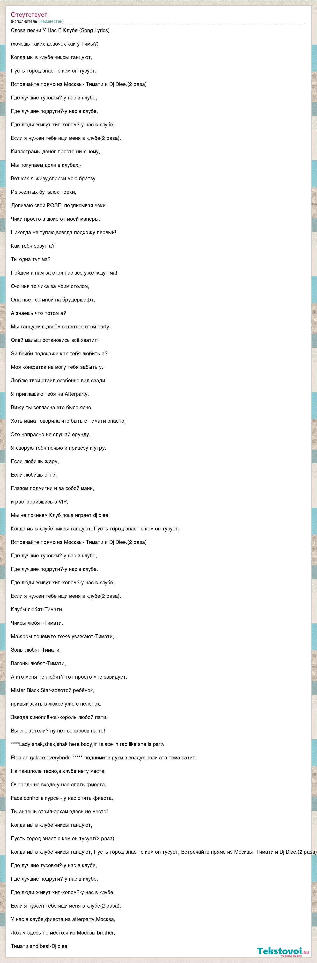Слова песни У Нас В Клубе (Song Lyrics) (хочешь таких девочек как у Тимы?) Когда мы в клубе чиксы танцуют, Пусть город знает с кем он тусует, Встречайте прямо из Москвы- Тимати и Dj Dlee.(2 раза) Где лучшие тусовки?-у нас в клубе, Где лучшие подруги?-у нас в клубе, Где люди живут хип-хопом?-у нас в клубе, Если я нужен тебе ищи меня в клубе(2 раза). Киллограмы денег просто ни к чему, Мы покупаем доли в клубах,- Вот как я живу,спроси мою братву Из желтых бутылок треки, Допиваю свой РОЗЕ, подписывая чеки. Чики просто в шоке от моей манеры, Никогда не туплю,всегда подхожу первый! Как тебя зовут-а? Ты одна тут ма? Пойдем к нам за стол нас все уже ждут ма! О-о чья то чика за моим столом, Она пьет со мной на брудершафт, А знаешь что потом а? Мы танцуем в двоём в центре этой party, Окей малыш остановись всё хватит! Эй бэйби подскажи как тебя любить а? Моя конфетка не могу тебя забыть у.. Люблю твой стайл,особенно вид сзади Я приглашаю тебя на Аfterparty. Вижу ты согласна,это было ясно, Хоть мама говорила что быть с Тимати опасно, Это напрасно не слушай ерунду, Я сворую тебя ночью и привезу к утру. Если любишь жару, Если любищь огни, Глазом подмигни и за собой мани, и растрорившись в VIP, Мы не покинем Клуб пока играет dj dlee! Когда мы в клубе чиксы танцуют, Пусть город знает с кем он тусует, Встречайте прямо из Москвы- Тимати и Dj Dlee.(2 раза) Где лучшие тусовки?-у нас в клубе, Где лучшие подруги?-у нас в клубе, Где люди живут хип-хопом?-у нас в клубе, Если я нужен тебе ищи меня в клубе(2 раза). Клубы любят-Тимати, Чиксы любят-Тимати, Мажоры почемуто тоже уважают-Тимати, Зоны любят-Тимати, Вагоны любят-Тимати, А кто меня не любит?-тот просто мне завидует. Мister Black Star-золотой ребёнок, привык жить в люксе уже с пелёнок, Звезда киноплёнок-король любой пати, Вы его хотели?-ну нет вопросов на те! ****Lady shak,shak,shak here body,in falace in rap like she is party Ftop an galace everybode *****-поднимите руки в воздух если эта тема катит, На танцполе тесно,в клубе нету места, Очередь на входе-у нас опять фиеста, Face control в курсе - у нас опять фиеста, Ты знаешь стайл-лохам здесь не место! Когда мы в клубе чиксы танцуют, Пусть город знает с кем он тусует(2 раза) Когда мы в клубе чиксы танцуют, Пусть город знает с кем он тусует, Встречайте прямо из Москвы- Тимати и Dj Dlee.(2 раза) Где лучшие тусовки?-у нас в клубе, Где лучшие подруги?-у нас в клубе, Где люди живут хип-хопом?-у нас в клубе, Если я нужен тебе ищи меня в клубе(2 раза). У нас в клубе,фиеста.на afterparty,Москва, Лохам здесь не место,я из Москвы brother, Тимати,and best-Dj dlee!