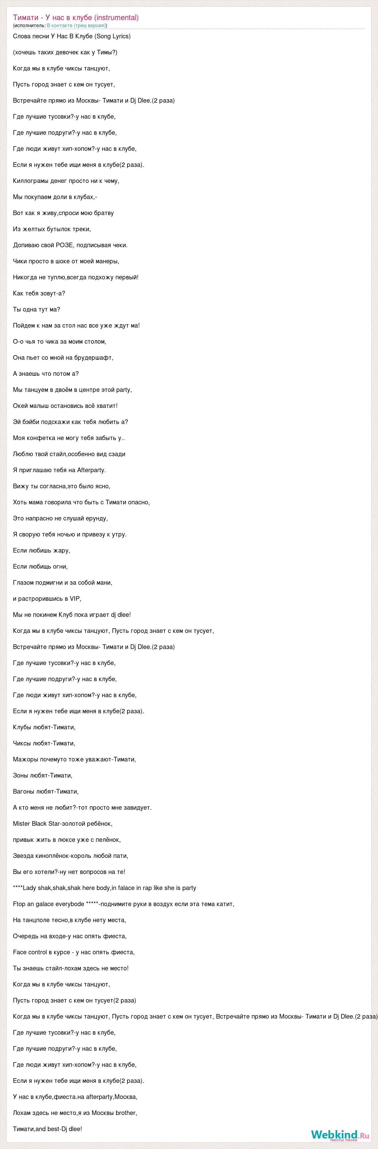 Слова песни У Нас В Клубе (Song Lyrics) (хочешь таких девочек как у Тимы?) Когда мы в клубе чиксы танцуют, Пусть город знает с кем он тусует, Встречайте прямо из Москвы- Тимати и Dj Dlee.(2 раза) Где лучшие тусовки?-у нас в клубе, Где лучшие подруги?-у нас в клубе, Где люди живут хип-хопом?-у нас в клубе, Если я нужен тебе ищи меня в клубе(2 раза). Киллограмы денег просто ни к чему, Мы покупаем доли в клубах,- Вот как я живу,спроси мою братву Из желтых бутылок треки, Допиваю свой РОЗЕ, подписывая чеки. Чики просто в шоке от моей манеры, Никогда не туплю,всегда подхожу первый! Как тебя зовут-а? Ты одна тут ма? Пойдем к нам за стол нас все уже ждут ма! О-о чья то чика за моим столом, Она пьет со мной на брудершафт, А знаешь что потом а? Мы танцуем в двоём в центре этой party, Окей малыш остановись всё хватит! Эй бэйби подскажи как тебя любить а? Моя конфетка не могу тебя забыть у.. Люблю твой стайл,особенно вид сзади Я приглашаю тебя на Аfterparty. Вижу ты согласна,это было ясно, Хоть мама говорила что быть с Тимати опасно, Это напрасно не слушай ерунду, Я сворую тебя ночью и привезу к утру. Если любишь жару, Если любищь огни, Глазом подмигни и за собой мани, и растрорившись в VIP, Мы не покинем Клуб пока играет dj dlee! Когда мы в клубе чиксы танцуют, Пусть город знает с кем он тусует, Встречайте прямо из Москвы- Тимати и Dj Dlee.(2 раза) Где лучшие тусовки?-у нас в клубе, Где лучшие подруги?-у нас в клубе, Где люди живут хип-хопом?-у нас в клубе, Если я нужен тебе ищи меня в клубе(2 раза). Клубы любят-Тимати, Чиксы любят-Тимати, Мажоры почемуто тоже уважают-Тимати, Зоны любят-Тимати, Вагоны любят-Тимати, А кто меня не любит?-тот просто мне завидует. Мister Black Star-золотой ребёнок, привык жить в люксе уже с пелёнок, Звезда киноплёнок-король любой пати, Вы его хотели?-ну нет вопросов на те! ****Lady shak,shak,shak here body,in falace in rap like she is party Ftop an galace everybode *****-поднимите руки в воздух если эта тема катит, На танцполе тесно,в клубе нету места, Очередь на входе-у нас опять фиеста, Face control в курсе - у нас опять фиеста, Ты знаешь стайл-лохам здесь не место! Когда мы в клубе чиксы танцуют, Пусть город знает с кем он тусует(2 раза) Когда мы в клубе чиксы танцуют, Пусть город знает с кем он тусует, Встречайте прямо из Москвы- Тимати и Dj Dlee.(2 раза) Где лучшие тусовки?-у нас в клубе, Где лучшие подруги?-у нас в клубе, Где люди живут хип-хопом?-у нас в клубе, Если я нужен тебе ищи меня в клубе(2 раза). У нас в клубе,фиеста.на afterparty,Москва, Лохам здесь не место,я из Москвы brother, Тимати,and best-Dj dlee!