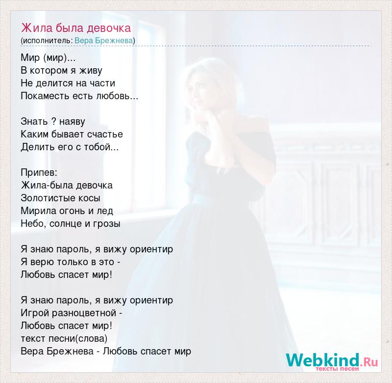 Мир (мир)... В котором я живу Не делится на части Покаместь есть любовь... Знать ? наяву Каким бывает счастье Делить его с тобой... Припев: Жила-была девочка Золотистые косы Мирила огонь и лед Небо, солнце и грозы Я знаю пароль, я вижу ориентир Я верю только в это - Любовь спасет мир! Я знаю пароль, я вижу ориентир Игрой разноцветной - Любовь спасет мир! текст песни(слова) Вера Брежнева - Любовь спасет мир