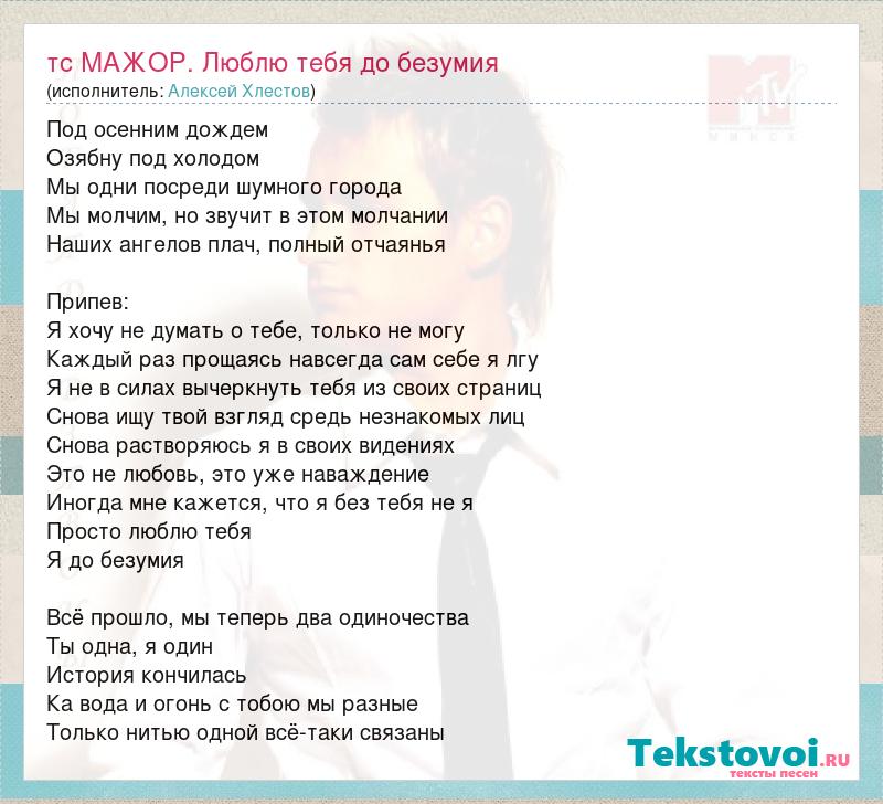 Под осенним дождем Озябну под холодом Мы одни посреди шумного города Мы молчим, но звучит в этом молчании Наших ангелов плач, полный отчаянья Припев: Я хочу не думать о тебе, только не могу Каждый раз прощаясь навсегда сам себе я лгу Я не в силах вычеркнуть тебя из своих страниц Снова ищу твой взгляд средь незнакомых лиц Снова растворяюсь я в своих видениях Это не любовь, это уже наваждение Иногда мне кажется, что я без тебя не я Просто люблю тебя Я до безумия Всё прошло, мы теперь два одиночества Ты одна, я один История кончилась Ка вода и огонь с тобою мы разные Только нитью одной всё-таки связаны