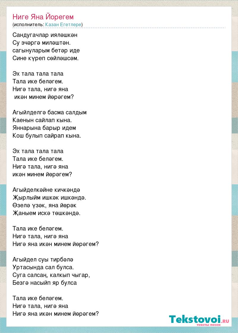 Сандугачлар ияләшкән Су эчәргә миләштән. сагынуларым бетәр иде Сине күреп сөйләшсәм. Эх тала тала тала Тала ике беләгем. Нигә тала, нигә яна икән минем йөрәгем? Агыйлделгә басма салдым Каенын сайлап кына. Яннарына барыр идем Кош булып сайрап кына. Эх тала тала тала Тала ике беләгем. Нигә тала, нигә яна икән минем йөрәгем? Агыйделкәйне кичкәндә Җырлыйм ишкәк ишкәндә. Өзелә үзәк, яна йөрәк Җаныем искә төшкәндә. Тала ике беләгем. Нигә тала, нигә яна Нигә яна икән минем йөрәгем? Агыйдел суы тирбәлә Уртасында сал булса. Суга салсаң, калкып чыгар, Безгә насыйп яр булса Тала ике беләгем. Нигә тала, нигә яна Нигә яна икән минем йөрәгем?
