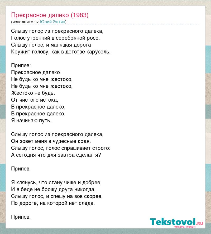 Слышу голос из прекрасного далека, Голос утренний в серебряной росе. Слышу голос, и манящая дорога Кружит голову, как в детстве карусель. Припев: Прекрасное далеко Не будь ко мне жестоко, Не будь ко мне жестоко, Жестоко не будь. От чистого истока, В прекрасное далеко, В прекрасное далеко, Я начинаю путь. Слышу голос из прекрасного далека, Он зовет меня в чудесные края. Слышу голос, голос спрашивает строго: А сегодня что для завтра сделал я? Припев. Я клянусь, что стану чище и добрее, И в беде не брошу друга никогда. Слышу голос, и спешу на зов скорее, По дороге, на которой нет следа. Припев.