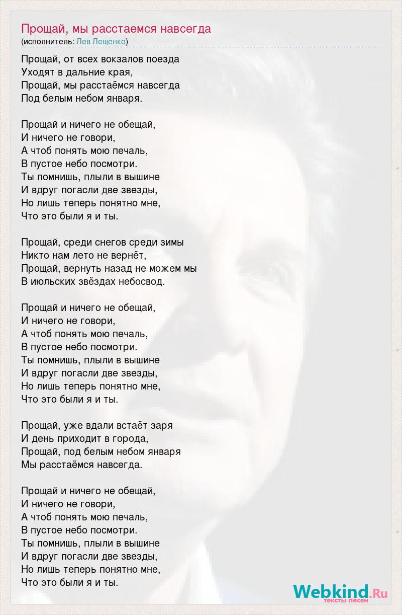 Прощай, от всех вокзалов поезда Уходят в дальние края, Прощай, мы расстаёмся навсегда Под белым небом января. Прощай и ничего не обещай, И ничего не говори, А чтоб понять мою печаль, В пустое небо посмотри. Ты помнишь, плыли в вышине И вдруг погасли две звезды, Но лишь теперь понятно мне, Что это были я и ты. Прощай, среди снегов среди зимы Никто нам лето не вернёт, Прощай, вернуть назад не можем мы В июльских звёздах небосвод. Прощай и ничего не обещай, И ничего не говори, А чтоб понять мою печаль, В пустое небо посмотри. Ты помнишь, плыли в вышине И вдруг погасли две звезды, Но лишь теперь понятно мне, Что это были я и ты. Прощай, уже вдали встаёт заря И день приходит в города, Прощай, под белым небом января Мы расстаёмся навсегда. Прощай и ничего не обещай, И ничего не говори, А чтоб понять мою печаль, В пустое небо посмотри. Ты помнишь, плыли в вышине И вдруг погасли две звезды, Но лишь теперь понятно мне, Что это были я и ты.