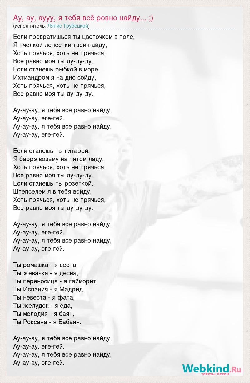 Если превратишься ты цветочком в поле, Я пчелкой лепестки твои найду, Хоть прячься, хоть не прячься, Все равно моя ты ду-ду-ду. Если станешь рыбкой в море, Ихтиандром я на дно сойду, Хоть прячься, хоть не прячься, Все равно моя ты ду-ду-ду. Ау-ау-ау, я тебя все равно найду, Ау-ау-ау, эге-гей. Ау-ау-ау, я тебя все равно найду, Ау-ау-ау, эге-гей. Если станешь ты гитарой, Я баррэ возьму на пятом ладу, Хоть прячься, хоть не прячься, Все равно моя ты ду-ду-ду. Если станешь ты розеткой, Штепселем я в тебя войду, Хоть прячься, хоть не прячься, Все равно моя ты ду-ду-ду. Ау-ау-ау, я тебя все равно найду, Ау-ау-ау, эге-гей. Ау-ау-ау, я тебя все равно найду, Ау-ау-ау, эге-гей. Ты ромашка - я весна, Ты жeвачка - я десна, Ты переносица - я гайморит, Ты Испания - я Мадрид. Ты невеста - я фата, Ты желудок - я еда, Ты мелодия - я баян, Ты Роксана - я Бабаян. Ау-ау-ау, я тебя все равно найду, Ау-ау-ау, эге-гей. Ау-ау-ау, я тебя все равно найду, Ау-ау-ау, эге-гей.