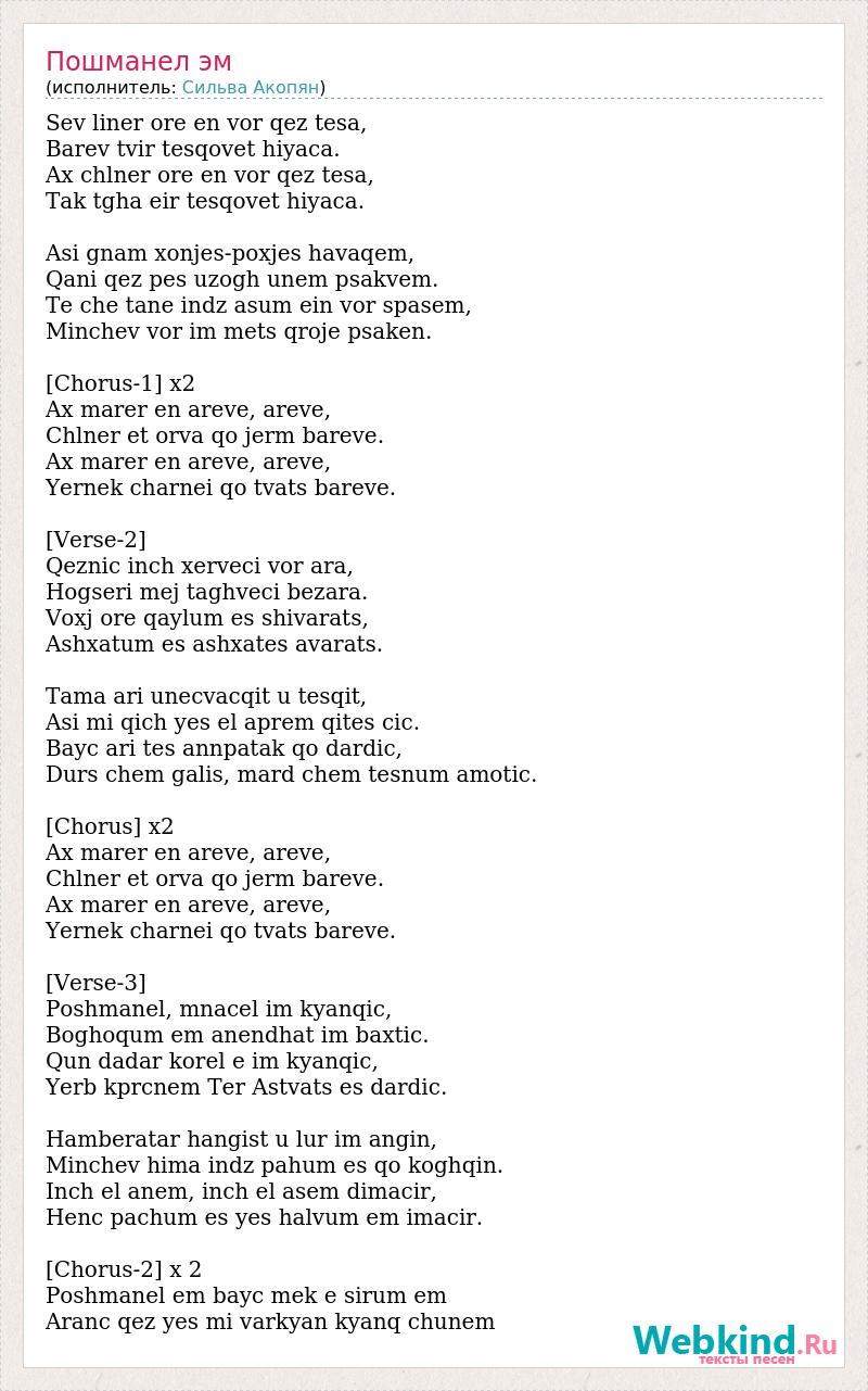 Sev liner ore en vor qez tesa, Barev tvir tesqovet hiyaca. Ax chlner ore en vor qez tesa, Tak tgha eir tesqovet hiyaca. Asi gnam xonjes-poxjes havaqem, Qani qez pes uzogh unem psakvem. Te che tane indz asum ein vor spasem, Minchev vor im mets qroje psaken. [Chorus-1] x2 Ax marer en areve, areve, Chlner et orva qo jerm bareve. Ax marer en areve, areve, Yernek charnei qo tvats bareve. [Verse-2] Qeznic inch xerveci vor ara, Hogseri mej taghveci bezara. Voxj ore qaylum es shivarats, Ashxatum es ashxates avarats. Tama ari unecvacqit u tesqit, Asi mi qich yes el aprem qites cic. Bayc ari tes annpatak qo dardic, Durs chem galis, mard chem tesnum amotic. [Chorus] x2 Ax marer en areve, areve, Chlner et orva qo jerm bareve. Ax marer en areve, areve, Yernek charnei qo tvats bareve. [Verse-3] Poshmanel, mnacel im kyanqic, Boghoqum em anendhat im baxtic. Qun dadar korel e im kyanqic, Yerb kprcnem Ter Astvats es dardic. Hamberatar hangist u lur im angin, Minchev hima indz pahum es qo koghqin. Inch el anem, inch el asem dimacir, Henc pachum es yes halvum em imacir. [Chorus-2] x 2 Poshmanel em bayc mek e sirum em Aranc qez yes mi varkyan kyanq chunem