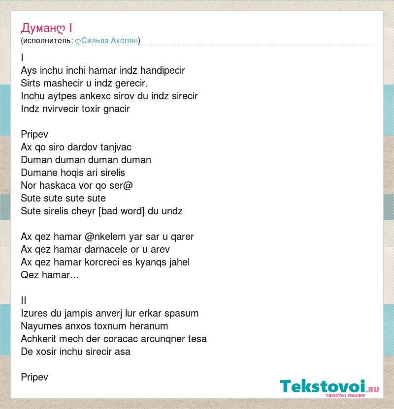 I Ays inchu inchi hamar indz handipecir Sirts mashecir u indz gerecir. Inchu aytpes ankexc sirov du indz sirecir Indz nvirvecir toxir gnacir Pripev Ax qo siro dardov tanjvac Duman duman duman duman Dumane hoqis ari sirelis Nor haskaca vor qo ser@ Sute sute sute sute Sute sirelis cheyr sirum du undz Ax qez hamar @nkelem yar sar u qarer Ax qez hamar darnacele or u arev Ax qez hamar korcreci es kyanqs jahel Qez hamar... II Izures du jampis anverj lur erkar spasum Nayumes anxos toxnum heranum Achkerit mech der coracac arcunqner tesa De xosir inchu sirecir asa Pripev