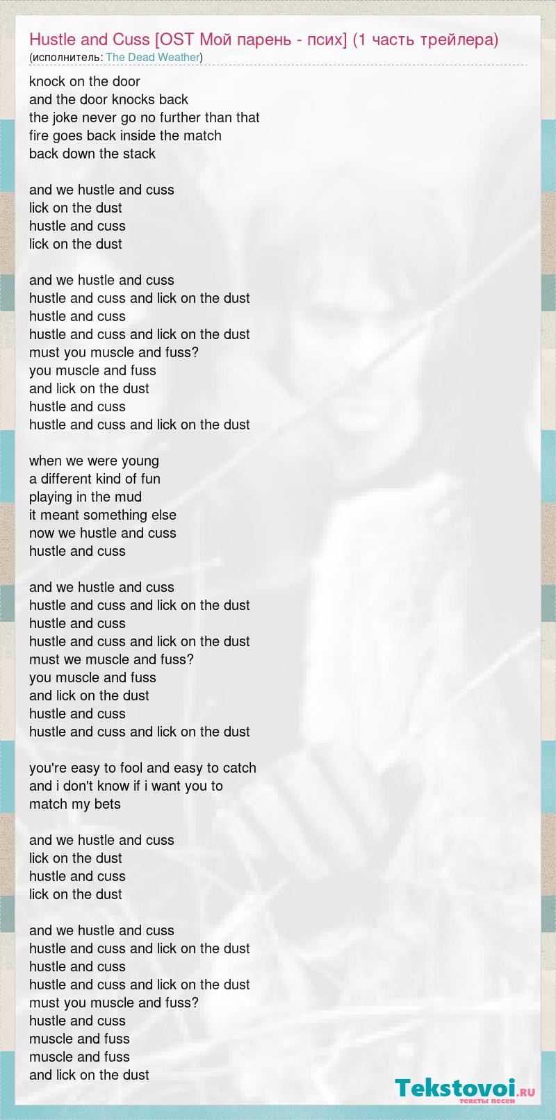 knock on the door and the door knocks back the joke never go no further than that fire goes back inside the match back down the stack and we hustle and cuss lick on the dust hustle and cuss lick on the dust and we hustle and cuss hustle and cuss and lick on the dust hustle and cuss hustle and cuss and lick on the dust must you muscle and fuss? you muscle and fuss and lick on the dust hustle and cuss hustle and cuss and lick on the dust when we were young a different kind of fun playing in the mud it meant something else now we hustle and cuss hustle and cuss and we hustle and cuss hustle and cuss and lick on the dust hustle and cuss hustle and cuss and lick on the dust must we muscle and fuss? you muscle and fuss and lick on the dust hustle and cuss hustle and cuss and lick on the dust you're easy to fool and easy to catch and i don't know if i want you to match my bets and we hustle and cuss lick on the dust hustle and cuss lick on the dust and we hustle and cuss hustle and cuss and lick on the dust hustle and cuss hustle and cuss and lick on the dust must you muscle and fuss? hustle and cuss muscle and fuss muscle and fuss and lick on the dust