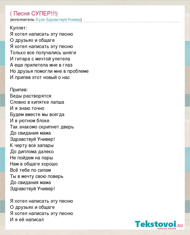 Куплет: Я хотел написать эту песню О друзьях и общаге Я хотел написать эту песню Только все получались шняги И гитара с мечтой улетела А еще прилетела мне в глаз Но друзья помогли мне в проблеме И припев этот новый о нас Припев: Беды растворятся Словно в кипятке лапша И я знаю точно Будем вместе мы всегда И в уютном блоке Так знакомо скрипнет дверь До свидания мама Здравствуй Универ! К черту все запары До диплома далеко Не пойдем на пары Нам в общаге хорошо Всё тебе по силам Ты в мечту свою поверь До свидания мама Здравствуй Универ! Я хотел написать эту песню О друзьях и общаге Я хотел написать эту песню И я её написал