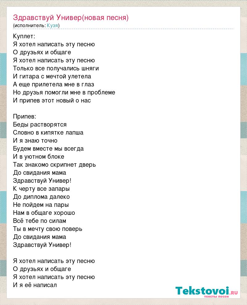 Куплет: Я хотел написать эту песню О друзьях и общаге Я хотел написать эту песню Только все получались шняги И гитара с мечтой улетела А еще прилетела мне в глаз Но друзья помогли мне в проблеме И припев этот новый о нас Припев: Беды растворятся Словно в кипятке лапша И я знаю точно Будем вместе мы всегда И в уютном блоке Так знакомо скрипнет дверь До свидания мама Здравствуй Универ! К черту все запары До диплома далеко Не пойдем на пары Нам в общаге хорошо Всё тебе по силам Ты в мечту свою поверь До свидания мама Здравствуй Универ! Я хотел написать эту песню О друзьях и общаге Я хотел написать эту песню И я её написал