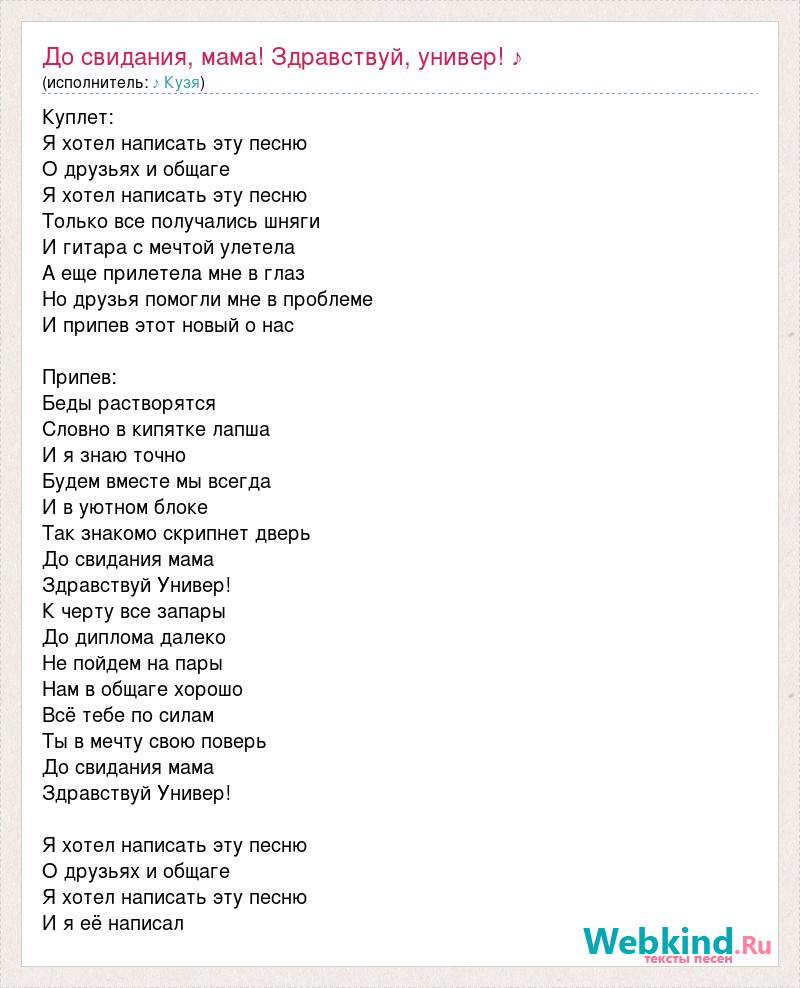 Куплет: Я хотел написать эту песню О друзьях и общаге Я хотел написать эту песню Только все получались шняги И гитара с мечтой улетела А еще прилетела мне в глаз Но друзья помогли мне в проблеме И припев этот новый о нас Припев: Беды растворятся Словно в кипятке лапша И я знаю точно Будем вместе мы всегда И в уютном блоке Так знакомо скрипнет дверь До свидания мама Здравствуй Универ! К черту все запары До диплома далеко Не пойдем на пары Нам в общаге хорошо Всё тебе по силам Ты в мечту свою поверь До свидания мама Здравствуй Универ! Я хотел написать эту песню О друзьях и общаге Я хотел написать эту песню И я её написал