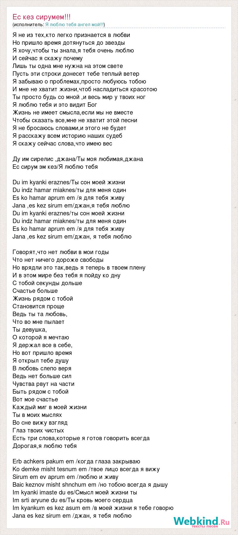 Я не из тех,кто легко признается в любви Но пришло время дотянуться до звезды Я хочу,чтобы ты знала,я тебя очень люблю И сейчас я скажу почему Лишь ты одна мне нужна на этом свете Пусть эти строки донесет тебе теплый ветер Я забываю о проблемах,просто любуюсь тобою И мне не хватит жизни,чтоб насладиться красотою Ты просто будь со мной ,и весь мир у твоих ног Я люблю тебя и это видит Бог Жизнь не имеет смысла,если мы не вместе Чтобы сказать все,мне не хватит этой песни Я не бросаюсь словами,и этого не будет Я расскажу всем историю наших судеб Я скажу сейчас слова,что имею вес Ду им сирелис ,джана/Ты моя любимая,джана Ес сирум эм кез/Я люблю тебя Du im kyanki eraznes/Ты сон моей жизни Du indz hamar miaknes/ты для меня один Es ko hamar aprum em /я для тебя живу Jana ,es kez sirum em/джан,я тебя люблю Du im kyanki eraznes/ты сон моей жизни Du indz hamar miaknes/ты для меня один Es ko hamar aprum em /я для тебя живу Jana ,es kez sirum em/джан, я тебя люблю Говорят,что нет любви в мои годы Что нет ничего дороже свободы Но врядли это так,ведь я теперь в твоем плену И в этом мире без тебя я пойду ко дну С тобой секунды дольше Счастье больше Жизнь рядом с тобой Становится проще Ведь ты та любовь, Что во мне пылает Ты девушка, О которой я мечтаю Я держал все в себе, Но вот пришло время Я открыл тебе душу В любовь слепо веря Ведь нет больше сил Чувства рвут на части Быть рядом с тобой Вот мое счастье Каждый миг в моей жизни Ты в моих мыслях Во сне вижу взгляд Глаз твоих чистых Есть три слова,которые я готов говорить всегда Дорогая,я люблю тебя Erb achkers pakum em /когда глаза закрываю Ko demke misht tesnum em /твое лицо всегда я вижу Sirum em ev aprum em /люблю и живу Baic keznov misht shnchum em /но тобою всегда я дышу Im kyanki imaste du es/Смысл моей жизни ты Im srti aryune du es/Ты кровь моего сердца Im kyankum es kez asum em /в моей жизни я тебе говорю Jana es kez sirum em /джан, я тебя люблю