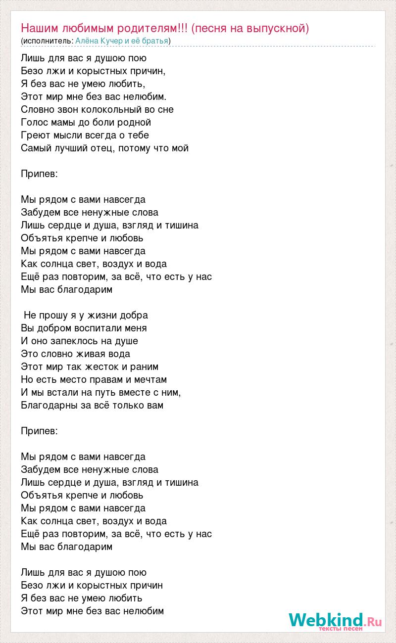 Лишь для вас я душою пою Безо лжи и корыстных причин, Я без вас не умею любить, Этот мир мне без вас нелюбим. Словно звон колокольный во сне Голос мамы до боли родной Греют мысли всегда о тебе Самый лучший отец, потому что мой Припев: Мы рядом с вами навсегда Забудем все ненужные слова Лишь сердце и душа, взгляд и тишина Объятья крепче и любовь Мы рядом с вами навсегда Как солнца свет, воздух и вода Ещё раз повторим, за всё, что есть у нас Мы вас благодарим Не прошу я у жизни добра Вы добром воспитали меня И оно запеклось на душе Это словно живая вода Этот мир так жесток и раним Но есть место правам и мечтам И мы встали на путь вместе с ним, Благодарны за всё только вам Припев: Мы рядом с вами навсегда Забудем все ненужные слова Лишь сердце и душа, взгляд и тишина Объятья крепче и любовь Мы рядом с вами навсегда Как солнца свет, воздух и вода Ещё раз повторим, за всё, что есть у нас Мы вас благодарим Лишь для вас я душою пою Безо лжи и корыстных причин Я без вас не умею любить Этот мир мне без вас нелюбим