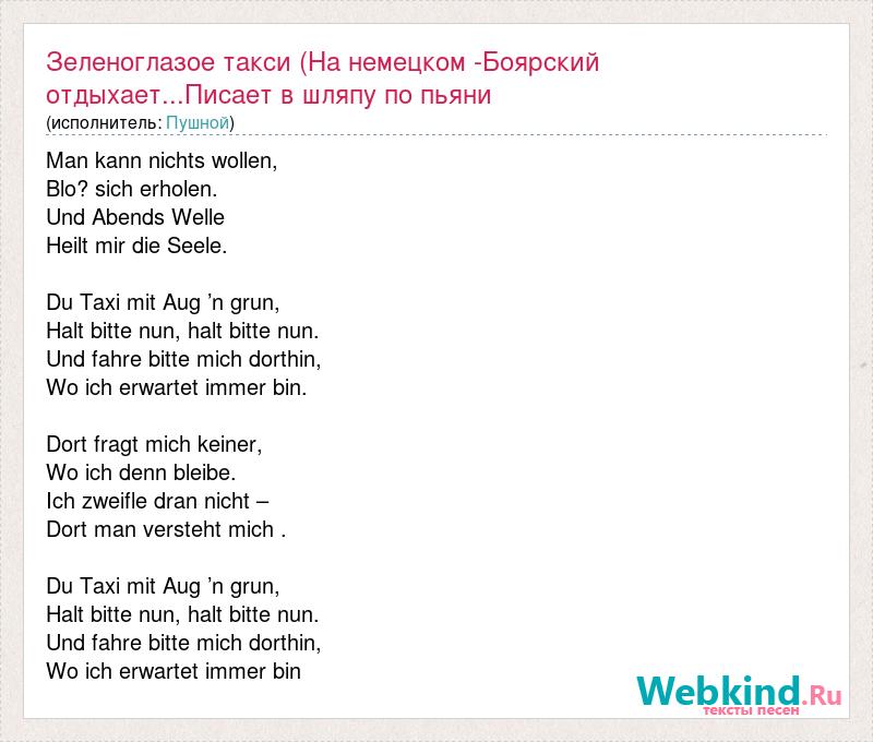 Главная→Исполнители→Пушной→Зеленоглазое такси (На немецком -Боярский отдыхает...Писает в шляпу по пьяни