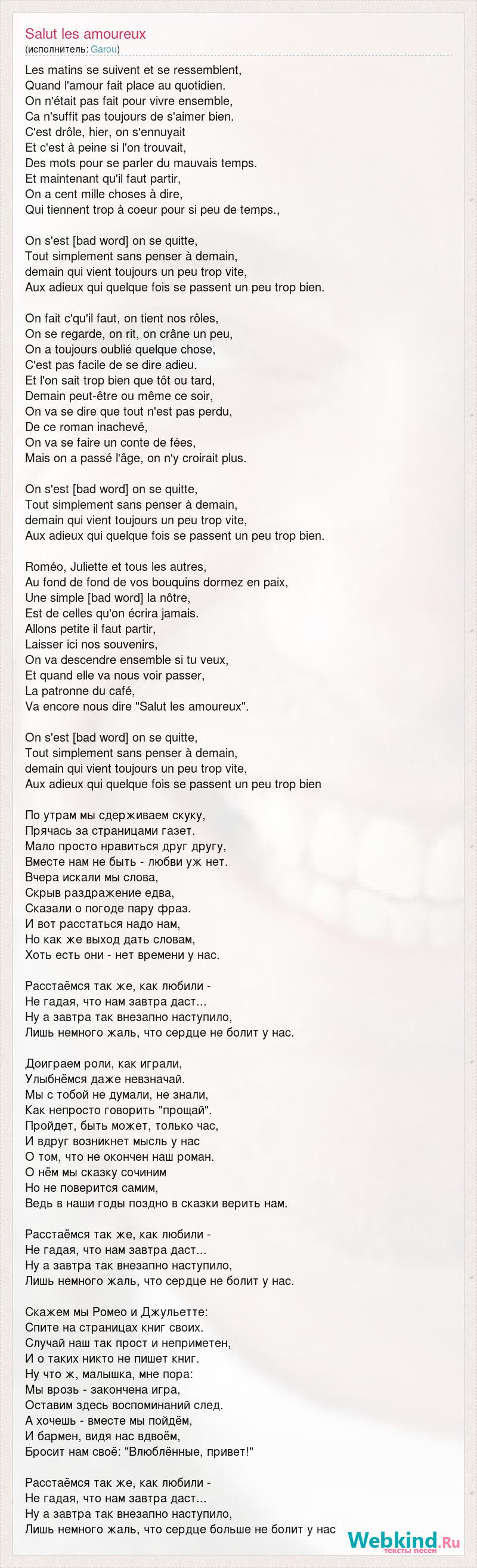 Les matins se suivent et se ressemblent, Quand l'amour fait place au quotidien. On n'était pas fait pour vivre ensemble, Ca n'suffit pas toujours de s'aimer bien. C'est drôle, hier, on s'ennuyait Et c'est à peine si l'on trouvait, Des mots pour se parler du mauvais temps. Et maintenant qu'il faut partir, On a cent mille choses à dire, Qui tiennent trop à coeur pour si peu de temps., On s'est [bad word] on se quitte, Tout simplement sans penser à demain, demain qui vient toujours un peu trop vite, Aux adieux qui quelque fois se passent un peu trop bien. On fait c'qu'il faut, on tient nos rôles, On se regarde, on rit, on crâne un peu, On a toujours oublié quelque chose, C'est pas facile de se dire adieu. Et l'on sait trop bien que tôt ou tard, Demain peut-être ou même ce soir, On va se dire que tout n'est pas perdu, De ce roman inachevé, On va se faire un conte de fées, Mais on a passé l'âge, on n'y croirait plus. On s'est [bad word] on se quitte, Tout simplement sans penser à demain, demain qui vient toujours un peu trop vite, Aux adieux qui quelque fois se passent un peu trop bien. Roméo, Juliette et tous les autres, Au fond de fond de vos bouquins dormez en paix, Une simple [bad word] la nôtre, Est de celles qu'on écrira jamais. Allons petite il faut partir, Laisser ici nos souvenirs, On va descendre ensemble si tu veux, Et quand elle va nous voir passer, La patronne du café, Va encore nous dire "Salut les amoureux". On s'est [bad word] on se quitte, Tout simplement sans penser à demain, demain qui vient toujours un peu trop vite, Aux adieux qui quelque fois se passent un peu trop bien По утрам мы сдерживаем скуку, Прячась за страницами газет. Мало просто нравиться друг другу, Вместе нам не быть - любви уж нет. Вчера искали мы слова, Скрыв раздражение едва, Сказали о погоде пару фраз. И вот расстаться надо нам, Но как же выход дать словам, Хоть есть они - нет времени у нас. Расстаёмся так же, как любили - Не гадая, что нам завтра даст... Ну а завтра так внезапно наступило, Лишь немного жаль, что сердце не болит у нас. Доиграем роли, как играли, Улыбнёмся даже невзначай. Мы с тобой не думали, не знали, Как непросто говорить "прощай". Пройдет, быть может, только час, И вдруг возникнет мысль у нас О том, что не окончен наш роман. О нём мы сказку сочиним Но не поверится самим, Ведь в наши годы поздно в сказки верить нам. Расстаёмся так же, как любили - Не гадая, что нам завтра даст... Ну а завтра так внезапно наступило, Лишь немного жаль, что сердце не болит у нас. Скажем мы Ромео и Джульетте: Спите на страницах книг своих. Случай наш так прост и неприметен, И о таких никто не пишет книг. Ну что ж, малышка, мне пора: Мы врозь - закончена игра, Оставим здесь воспоминаний след. А хочешь - вместе мы пойдём, И бармен, видя нас вдвоём, Бросит нам своё: "Влюблённые, привет!" Расстаёмся так же, как любили - Не гадая, что нам завтра даст... Ну а завтра так внезапно наступило, Лишь немного жаль, что сердце больше не болит у нас