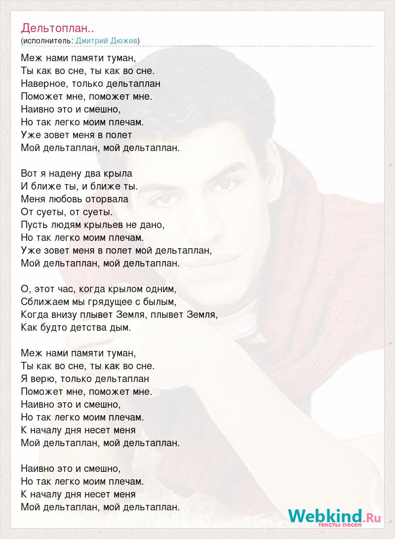 Меж нами памяти туман, Ты как во сне, ты как во сне. Наверное, только дельтаплан Поможет мне, поможет мне. Наивно это и смешно, Но так легко моим плечам. Уже зовет меня в полет Мой дельтаплан, мой дельтаплан. Вот я надену два крыла И ближе ты, и ближе ты. Меня любовь оторвала От суеты, от суеты. Пусть людям крыльев не дано, Но так легко моим плечам. Уже зовет меня в полет мой дельтаплан, Мой дельтаплан, мой дельтаплан. О, этот час, когда крылом одним, Сближаем мы грядущее с былым, Когда внизу плывет Земля, плывет Земля, Как будто детства дым. Меж нами памяти туман, Ты как во сне, ты как во сне. Я верю, только дельтаплан Поможет мне, поможет мне. Наивно это и смешно, Но так легко моим плечам. К началу дня несет меня Мой дельтаплан, мой дельтаплан. Наивно это и смешно, Но так легко моим плечам. К началу дня несет меня Мой дельтаплан, мой дельтаплан.