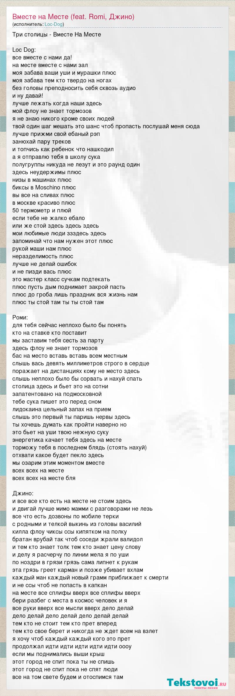 Три столицы - Вместе На Месте Loc Dog: все вместе с нами да! на месте вместе с нами зал моя забава ваши уши и мурашки плюс моя забава тем кто твердо на ногах без головы преподносить себя сквозь аудио и ну давай! лучше лежать когда наши здесь мой флоу не знает тормозов я не знаю никого кроме своих людей твой один шаг мешать это шанс чтоб пропасть послушай меня сюда лучше прижми свой ебаный рэп занюхай пару треков и топчись как ребенок что нашкодил а я отправлю тебя в школу сука полугруппы никуда не лезут и это раунд один здесь неудержимы плюс низы в машинах плюс биксы в Moschino плюс вы все на сливах плюс в москве красиво плюс 50 термометр и плюй если тебе не жалко ебало или же стой здесь здесь здесь мои любимые люди ззздесь здесь запоминай что нам нужен этот плюс рукой маши нам плюс неразделимость плюс лучше не делай ошибок и не пизди вась плюс это мастер класс сучкам подтекать плюс пусть дым поднимает закрой пасть плюс до гроба лишь праздник вся жизнь нам плюс ты стой там ты ты стой там Роми: для тебя сейчас неплохо было бы понять кто на ставке кто поставит мы заставим тебя сесть за парту здесь флоу не знает тормозов бас на место вставь вставь всем местным слышь вась девять миллиметров строго в сердце поражает на дистанциях кому не место здесь слышь неплохо было бы сорвать и нахуй спать столица здесь и бьет это на сотни запатентовано на подмосковной тебе сука пишет это перед сном лидокаина цельный запах на прием слышь это первый ты паришь нервы здесь ты хочешь думать как пройти наверно но это бьет на уши твою нежную суку энергетика качает тебя здесь на месте торможу тебя в последнем блядь (стоять нахуй) отхвати какое будет пекло здесь мы озарим этим моментом вместе всех всех на месте всех всех на месте бля Джино: и все все кто есть на месте не стоим здесь и двигай лучше мимо мамми с разговорами не лезь все что есть дозвоны по мобиле терки с родными и телкой выкинь из головы василий килла флоу чиксы ссы кипятком на полку братан врубай так чтоб соседи жрали валидол и тем кто знает толк тем кто знает цену слову и делу я расчерчу по линии мела я по уши по ноздри в грязи грязь сама липнет к рукам эта грязь греет карман и позже убивает вхлам каждый ман каждый новый грамм приближает к смерти и не ссы чтоб не попасть в капкан на месте все сплифы вверх все сплифы вверх бери разбег с места в космос человек и я все руки вверх все мысли вверх дело делай дело делай дело делай дело делай делай тем кто не стоит тем кто прет вперед тем кто свое берет и никогда не ждет всем на взлет я хочу чтоб каждый каждый кого это прет продолжал идти идти идти идти идти оооу если мы поднимались выши крыш этот город не спит пока ты не спишь этот город не спит пока не спят люди все на том свете будем и отоспимся там