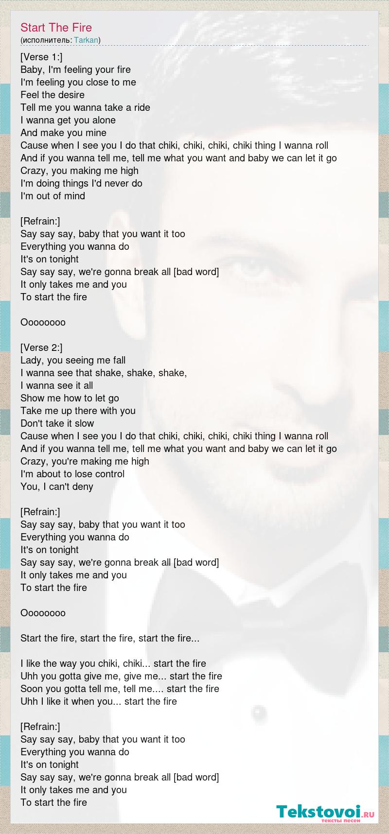 [Verse 1:] Baby, I'm feeling your fire I'm feeling you close to me Feel the desire Tell me you wanna take a ride I wanna get you alone And make you mine Cause when I see you I do that chiki, chiki, chiki, chiki thing I wanna roll And if you wanna tell me, tell me what you want and baby we can let it go Crazy, you making me high I'm doing things I'd never do I'm out of mind [Refrain:] Say say say, baby that you want it too Everything you wanna do It's on tonight Say say say, we're gonna break all the rules It only takes me and you To start the fire Oooooooo [Verse 2:] Lady, you seeing me fall I wanna see that shake, shake, shake, I wanna see it all Show me how to let go Take me up there with you Don't take it slow Cause when I see you I do that chiki, chiki, chiki, chiki thing I wanna roll And if you wanna tell me, tell me what you want and baby we can let it go Crazy, you're making me high I'm about to lose control You, I can't deny [Refrain:] Say say say, baby that you want it too Everything you wanna do It's on tonight Say say say, we're gonna break all the rules It only takes me and you To start the fire Oooooooo Start the fire, start the fire, start the fire... I like the way you chiki, chiki... start the fire Uhh you gotta give me, give me... start the fire Soon you gotta tell me, tell me.... start the fire Uhh I like it when you... start the fire [Refrain:] Say say say, baby that you want it too Everything you wanna do It's on tonight Say say say, we're gonna break all the rules It only takes me and you To start the fire