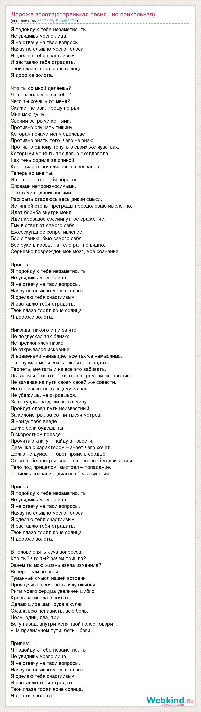 Я подойду к тебе незаметно. ты Не увидишь моего лица. Я не отвечу на твои вопросы. Наяву не слышно моего голоса. Я сделаю тебя счастливым И заставлю тебя страдать. Твои глаза горят ярче солнца. Я дороже золота. Что ты со мной делаешь? Что позволяешь ты себе? Чего ты хочешь от меня? Скажи. не рви, прошу не рви Мне мою душу Своими острыми когтями. Противно слушать тишину, Которая ночами меня одолевает. Противно знать того, чего не знаю. Противно одному тонуть в своих же чувствах, Которыми меня ты так давно околдовала. Как тень ходила за спиной. Как призрак появлялась ты внезапно. Теперь во мне ты. И не прогнать тебя обратно. Словами непроизносимыми, Текстами недописанными. Раскрыть стараюсь весь дикий смысл. Истинной стены преграды преодолеваю мысленно. Идет борьба внутри меня. Идет кровавое ежеминутное сражение. Ему в ответ от самого себя Ежесекундное сопротивление. Бой с тенью. бью самого себя. Все руки в кровь. на теле ран не видно. Серьезно поврежден мой мозг, мое сознание. Припев: Я подойду к тебе незаметно. ты Не увидишь моего лица. Я не отвечу на твои вопросы. Наяву не слышно моего голоса. Я сделаю тебя счастливым И заставлю тебя страдать. Твои глаза горят ярче солнца. Я дороже золота. Никогда. никого и ни за что Не подпускал так близко. Не преклонялся низко. Не открывался искренне. И временами ненавидел все также немыслимо. Ты научила меня жить, любить, страдать, Терпеть, мечтать и на все это забивать. Пытался я бежать. бежать с огромной скоростью. Не замечая на пути своем своей же совести. Но как известно каждому из нас Не убежишь, не скроешься. За секунды. за доли сотых минут. Пройдут слова путь неизвестный. За километры, за сотни тысяч метров. Я найду тебя везде. Даже если будешь ты В скоростном поезде. Прочитаю книгу – найду в повести. Девушка с характером – знает чего хочет. Долго не думает – бьет прямо в сердце. Стоит тебе раскрыться – ты неспособен двигаться. Тело под прицелом. выстрел – попадание. Теряешь сознание. диагноз без заикания. Припев: Я подойду к тебе незаметно. ты Не увидишь моего лица. Я не отвечу на твои вопросы. Наяву не слышно моего голоса. Я сделаю тебя счастливым И заставлю тебя страдать. Твои глаза горят ярче солнца. Я дороже золота. В голове опять куча вопросов. Кто ты? что ты? зачем пришла? Зачем ты мою жизнь взяла изменила? Вечер – сам не свой. Туманный смысл нашей встречи Прокручиваю вечность, ищу ошибки. Ритм моего сердца увеличен шибко. Кровь закипела в жилах. Делаю шире шаг. рука в кулак Сжала всю ненависть, всю боль. Ноль, один, два, три. Бегу назад, внутри меня твой голос говорит: «На правильном пути. беги…беги». Припев: Я подойду к тебе незаметно. ты Не увидишь моего лица. Я не отвечу на твои вопросы. Наяву не слышно моего голоса. Я сделаю тебя счастливым И заставлю тебя страдать. Твои глаза горят ярче солнца. Я дороже золота.