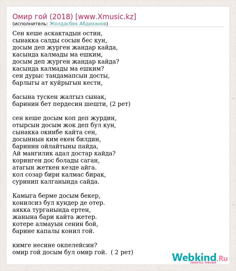 Сен кеше аскактадын остин, сынакка салды сосын бес кун, досым деп журген жандар кайда, касында калмады ма ешким, досым деп журген жандар кайда? касында калмады ма ешким? сен дурыс тандамапсын досты, барлыгы ат куйрыгын кести, басына тускен жалгыз сынак, баринин бет пердесин шешти, (2 рет) сен кеше досым коп деп журдин, отырсын досым жок деп бул кун, сынакка окинбе кайта сен, досыннын ким екен билдин, баринин ойлайтыны пайда, Ай мангилик адал достар кайда? коринген дос болады саган, атагын жеткен кезде айга. кол созар бири калмас бирак, суринип калганында сайда. Камыга берме досым бекер, конилсиз бул кундер де отер. аякка турганында ертен, жанына бари кайта жетер. котере алмауын сенин бой, барине капалы конил гой. кимге несине окпелейсин? омир гой досым бул омир гой. ( 2 рет)