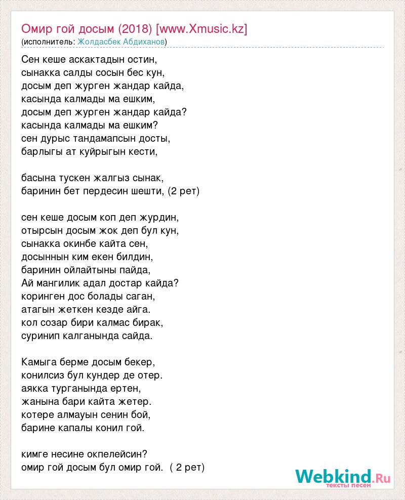 Сен кеше аскактадын остин, сынакка салды сосын бес кун, досым деп журген жандар кайда, касында калмады ма ешким, досым деп журген жандар кайда? касында калмады ма ешким? сен дурыс тандамапсын досты, барлыгы ат куйрыгын кести, басына тускен жалгыз сынак, баринин бет пердесин шешти, (2 рет) сен кеше досым коп деп журдин, отырсын досым жок деп бул кун, сынакка окинбе кайта сен, досыннын ким екен билдин, баринин ойлайтыны пайда, Ай мангилик адал достар кайда? коринген дос болады саган, атагын жеткен кезде айга. кол созар бири калмас бирак, суринип калганында сайда. Камыга берме досым бекер, конилсиз бул кундер де отер. аякка турганында ертен, жанына бари кайта жетер. котере алмауын сенин бой, барине капалы конил гой. кимге несине окпелейсин? омир гой досым бул омир гой. ( 2 рет)