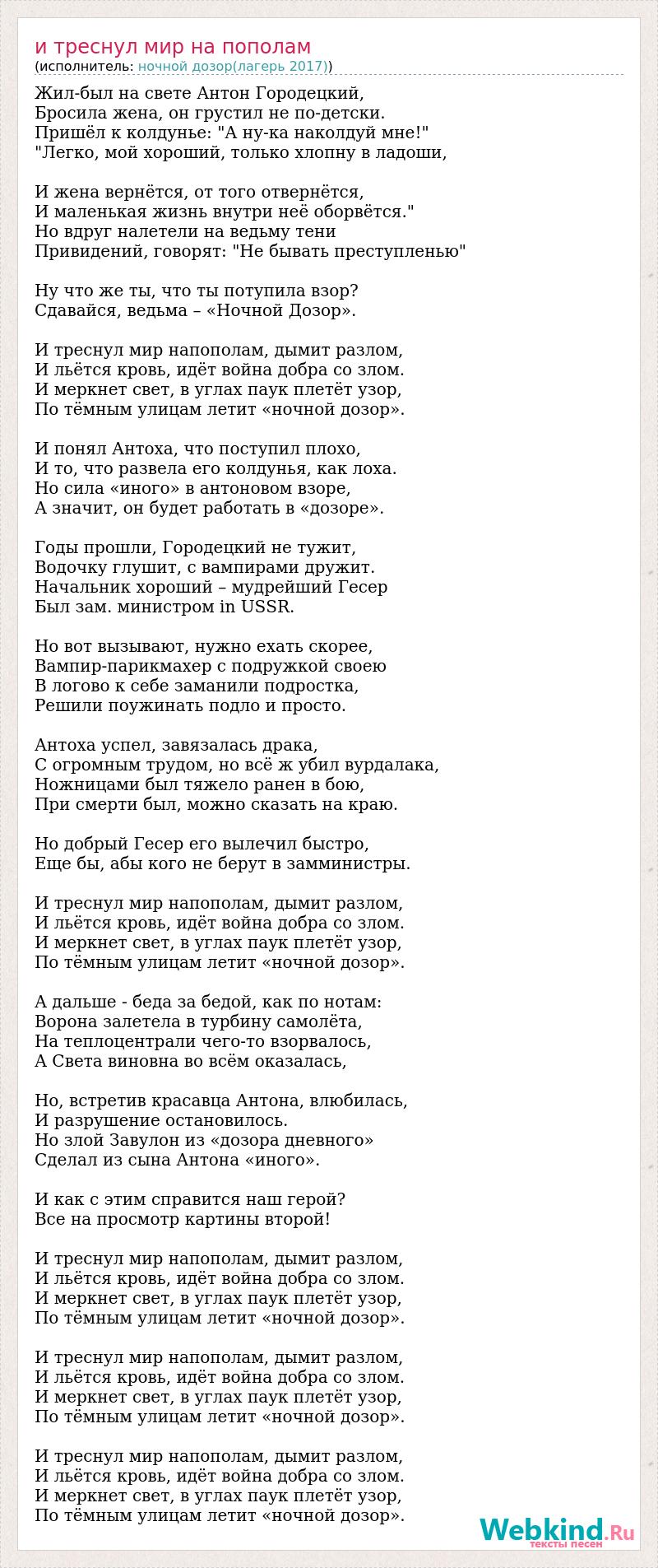 Жил-был на свете Антон Городецкий, Бросила жена, он грустил не по-детски. Пришёл к колдунье: "А ну-ка наколдуй мне!" "Легко, мой хороший, только хлопну в ладоши, И жена вернётся, от того отвернётся, И маленькая жизнь внутри неё оборвётся." Но вдруг налетели на ведьму тени Привидений, говорят: "Не бывать преступленью" Ну что же ты, что ты потупила взор? Сдавайся, ведьма – «Ночной Дозор». И треснул мир напополам, дымит разлом, И льётся кровь, идёт война добра со злом. И меркнет свет, в углах паук плетёт узор, По тёмным улицам летит «ночной дозор». И понял Антоха, что поступил плохо, И то, что развела его колдунья, как лоха. Но сила «иного» в антоновом взоре, А значит, он будет работать в «дозоре». Годы прошли, Городецкий не тужит, Водочку глушит, с вампирами дружит. Начальник хороший – мудрейший Гесер Был зам. министром in USSR. Но вот вызывают, нужно ехать скорее, Вампир-парикмахер с подружкой своею В логово к себе заманили подростка, Решили поужинать подло и просто. Антоха успел, завязалась драка, С огромным трудом, но всё ж убил вурдалака, Ножницами был тяжело ранен в бою, При смерти был, можно сказать на краю. Но добрый Гесер его вылечил быстро, Еще бы, абы кого не берут в замминистры. И треснул мир напополам, дымит разлом, И льётся кровь, идёт война добра со злом. И меркнет свет, в углах паук плетёт узор, По тёмным улицам летит «ночной дозор». А дальше - беда за бедой, как по нотам: Ворона залетела в турбину самолёта, На теплоцентрали чего-то взорвалось, А Света виновна во всём оказалась, Но, встретив красавца Антона, влюбилась, И разрушение остановилось. Но злой Завулон из «дозора дневного» Сделал из сына Антона «иного». И как с этим справится наш герой? Все на просмотр картины второй! И треснул мир напополам, дымит разлом, И льётся кровь, идёт война добра со злом. И меркнет свет, в углах паук плетёт узор, По тёмным улицам летит «ночной дозор». И треснул мир напополам, дымит разлом, И льётся кровь, идёт война добра со злом. И меркнет свет, в углах паук плетёт узор, По тёмным улицам летит «ночной дозор». И треснул мир напополам, дымит разлом, И льётся кровь, идёт война добра со злом. И меркнет свет, в углах паук плетёт узор, По тёмным улицам летит «ночной дозор».