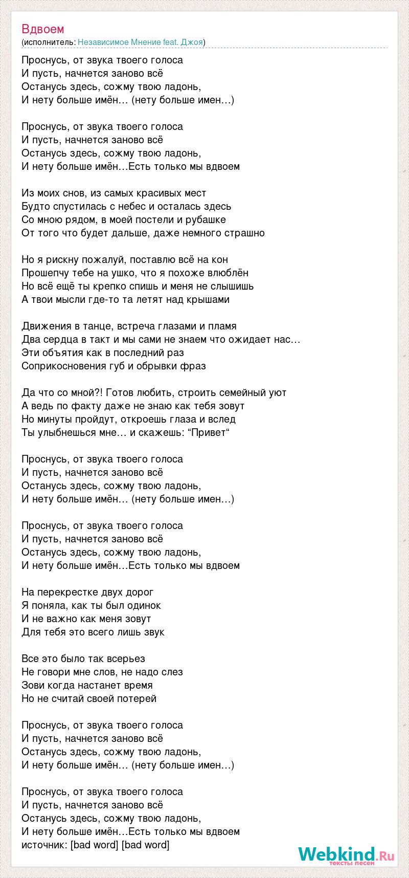 Проснусь, от звука твоего голоса И пусть, начнется заново всё Останусь здесь, сожму твою ладонь, И нету больше имён… (нету больше имен…) Проснусь, от звука твоего голоса И пусть, начнется заново всё Останусь здесь, сожму твою ладонь, И нету больше имён…Есть только мы вдвоем Из моих снов, из самых красивых мест Будто спустилась с небес и осталась здесь Со мною рядом, в моей постели и рубашке От того что будет дальше, даже немного страшно Но я рискну пожалуй, поставлю всё на кон Прошепчу тебе на ушко, что я похоже влюблён Но всё ещё ты крепко спишь и меня не слышишь А твои мысли где-то та летят над крышами Движения в танце, встреча глазами и пламя Два сердца в такт и мы сами не знаем что ожидает нас… Эти объятия как в последний раз Соприкосновения губ и обрывки фраз Да что со мной?! Готов любить, строить семейный уют А ведь по факту даже не знаю как тебя зовут Но минуты пройдут, откроешь глаза и вслед Ты улыбнешься мне… и скажешь: “Привет“ Проснусь, от звука твоего голоса И пусть, начнется заново всё Останусь здесь, сожму твою ладонь, И нету больше имён… (нету больше имен…) Проснусь, от звука твоего голоса И пусть, начнется заново всё Останусь здесь, сожму твою ладонь, И нету больше имён…Есть только мы вдвоем На перекрестке двух дорог Я поняла, как ты был одинок И не важно как меня зовут Для тебя это всего лишь звук Все это было так всерьез Не говори мне слов, не надо слез Зови когда настанет время Но не считай своей потерей Проснусь, от звука твоего голоса И пусть, начнется заново всё Останусь здесь, сожму твою ладонь, И нету больше имён… (нету больше имен…) Проснусь, от звука твоего голоса И пусть, начнется заново всё Останусь здесь, сожму твою ладонь, И нету больше имён…Есть только мы вдвоем источник: [bad word] [bad word]