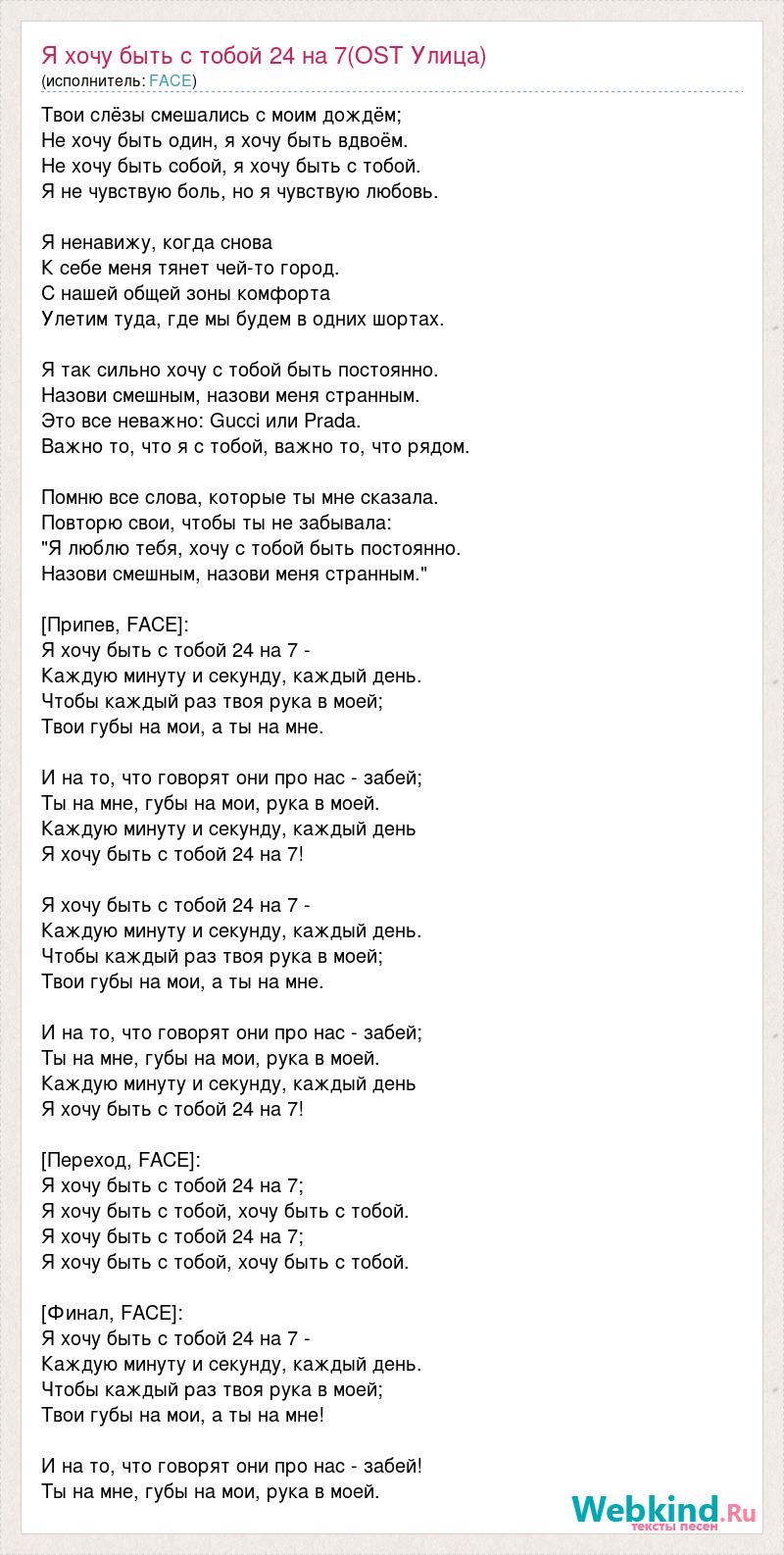 Твои слёзы смешались с моим дождём; Не хочу быть один, я хочу быть вдвоём. Не хочу быть собой, я хочу быть с тобой. Я не чувствую боль, но я чувствую любовь. Я ненавижу, когда снова К себе меня тянет чей-то город. С нашей общей зоны комфорта Улетим туда, где мы будем в одних шортах. Я так сильно хочу с тобой быть постоянно. Назови смешным, назови меня странным. Это все неважно: Gucci или Prada. Важно то, что я с тобой, важно то, что рядом. Помню все слова, которые ты мне сказала. Повторю свои, чтобы ты не забывала: "Я люблю тебя, хочу с тобой быть постоянно. Назови смешным, назови меня странным." [Припев, FACE]: Я хочу быть с тобой 24 на 7 - Каждую минуту и секунду, каждый день. Чтобы каждый раз твоя рука в моей; Твои губы на мои, а ты на мне. И на то, что говорят они про нас - забей; Ты на мне, губы на мои, рука в моей. Каждую минуту и секунду, каждый день Я хочу быть с тобой 24 на 7! Я хочу быть с тобой 24 на 7 - Каждую минуту и секунду, каждый день. Чтобы каждый раз твоя рука в моей; Твои губы на мои, а ты на мне. И на то, что говорят они про нас - забей; Ты на мне, губы на мои, рука в моей. Каждую минуту и секунду, каждый день Я хочу быть с тобой 24 на 7! [Переход, FACE]: Я хочу быть с тобой 24 на 7; Я хочу быть с тобой, хочу быть с тобой. Я хочу быть с тобой 24 на 7; Я хочу быть с тобой, хочу быть с тобой. [Финал, FACE]: Я хочу быть с тобой 24 на 7 - Каждую минуту и секунду, каждый день. Чтобы каждый раз твоя рука в моей; Твои губы на мои, а ты на мне! И на то, что говорят они про нас - забей! Ты на мне, губы на мои, рука в моей.