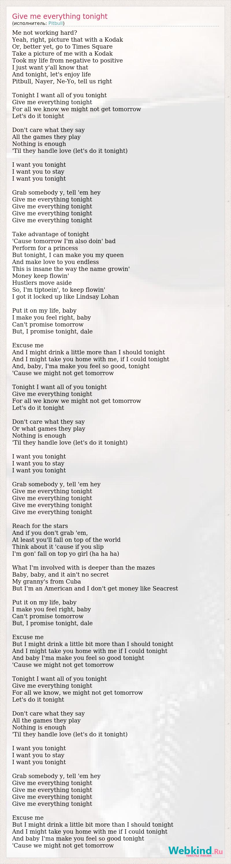 Me not working hard? Yeah, right, picture that with a Kodak Or, better yet, go to Times Square Take a picture of me with a Kodak Took my life from negative to positive I just want y'all know that And tonight, let's enjoy life Pitbull, Nayer, Ne-Yo, tell us right Tonight I want all of you tonight Give me everything tonight For all we know we might not get tomorrow Let's do it tonight Don't care what they say All the games they play Nothing is enough 'Til they handle love (let's do it tonight) I want you tonight I want you to stay I want you tonight Grab somebody y, tell 'em hey Give me everything tonight Give me everything tonight Give me everything tonight Give me everything tonight Take advantage of tonight 'Cause tomorrow I'm also doin' bad Perform for a princess But tonight, I can make you my queen And make love to you endless This is insane the way the name growin' Money keep flowin' Hustlers move aside So, I'm tiptoein', to keep flowin' I got it locked up like Lindsay Lohan Put it on my life, baby I make you feel right, baby Can't promise tomorrow But, I promise tonight, dale Excuse me And I might drink a little more than I should tonight And I might take you home with me, if I could tonight And, baby, I'ma make you feel so good, tonight 'Cause we might not get tomorrow Tonight I want all of you tonight Give me everything tonight For all we know we might not get tomorrow Let's do it tonight Don't care what they say Or what games they play Nothing is enough 'Til they handle love (let's do it tonight) I want you tonight I want you to stay I want you tonight Grab somebody y, tell 'em hey Give me everything tonight Give me everything tonight Give me everything tonight Give me everything tonight Reach for the stars And if you don't grab 'em, At least you'll fall on top of the world Think about it 'cause if you slip I'm gon' fall on top yo girl (ha ha ha) What I'm involved with is deeper than the mazes Baby, baby, and it ain't no secret My granny's from Cuba But I'm an American and I don't get money like Seacrest Put it on my life, baby I make you feel right, baby Can't promise tomorrow But, I promise tonight, dale Excuse me But I might drink a little bit more than I should tonight And I might take you home with me if I could tonight And baby I'ma make you feel so good tonight 'Cause we might not get tomorrow Tonight I want all of you tonight Give me everything tonight For all we know, we might not get tomorrow Let's do it tonight Don't care what they say All the games they play Nothing is enough 'Til they handle love (let's do it tonight) I want you tonight I want you to stay I want you tonight Grab somebody y, tell 'em hey Give me everything tonight Give me everything tonight Give me everything tonight Give me everything tonight Excuse me But I might drink a little bit more than I should tonight And I might take you home with me if I could tonight And baby I'ma make you feel so good tonight 'Cause we might not get tomorrow