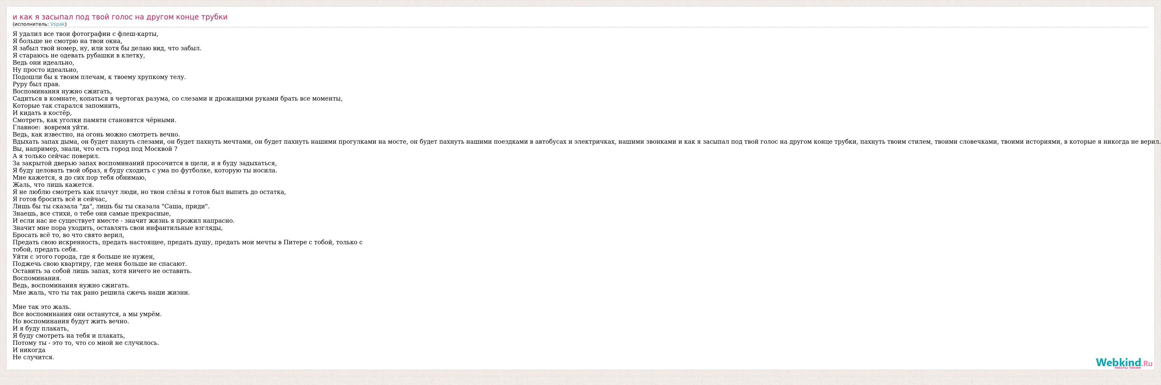 Я удалил все твои фотографии с флеш-карты, Я больше не смотрю на твои окна, Я забыл твой номер, ну, или хотя бы делаю вид, что забыл. Я стараюсь не одевать рубашки в клетку, Ведь они идеально, Ну просто идеально, Подошли бы к твоим плечам, к твоему хрупкому телу. Руру был прав. Воспоминания нужно сжигать, Садиться в комнате, копаться в чертогах разума, со слезами и дрожащими руками брать все моменты, Которые так старался запомнить, И кидать в костёр, Смотреть, как уголки памяти становятся чёрными. Главное: вовремя уйти. Ведь, как известно, на огонь можно смотреть вечно. Вдыхать запах дыма, он будет пахнуть слезами, он будет пахнуть мечтами, он будет пахнуть нашими прогулками на мосте, он будет пахнуть нашими поездками в автобусах и электричках, нашими звонками и как я засыпал под твой голос на другом конце трубки, пахнуть твоим стилем, твоими словечками, твоими историями, в которые я никогда не верил. Вы, например, знали, что есть город под Москвой ? А я только сейчас поверил. За закрытой дверью запах воспоминаний просочится в щели, и я буду задыхаться, Я буду целовать твой образ, я буду сходить с ума по футболке, которую ты носила. Мне кажется, я до сих пор тебя обнимаю, Жаль, что лишь кажется. Я не люблю смотреть как плачут люди, но твои слёзы я готов был выпить до остатка, Я готов бросить всё и сейчас, Лишь бы ты сказала "да", лишь бы ты сказала "Саша, приди". Знаешь, все стихи, о тебе они самые прекрасные, И если нас не существует вместе - значит жизнь я прожил напрасно. Значит мне пора уходить, оставлять свои инфантильные взгляды, Бросать всё то, во что свято верил, Предать свою искренность, предать настоящее, предать душу, предать мои мечты в Питере с тобой, только с тобой, предать себя. Уйти с этого города, где я больше не нужен, Поджечь свою квартиру, где меня больше не спасают. Оставить за собой лишь запах, хотя ничего не оставить. Воспоминания. Ведь, воспоминания нужно сжигать. Мне жаль, что ты так рано решила сжечь наши жизни. Мне так это жаль. Все воспоминания они останутся, а мы умрём. Но воспоминания будут жить вечно. И я буду плакать, Я буду смотреть на тебя и плакать, Потому ты - это то, что со мной не случилось. И никогда Не случится.