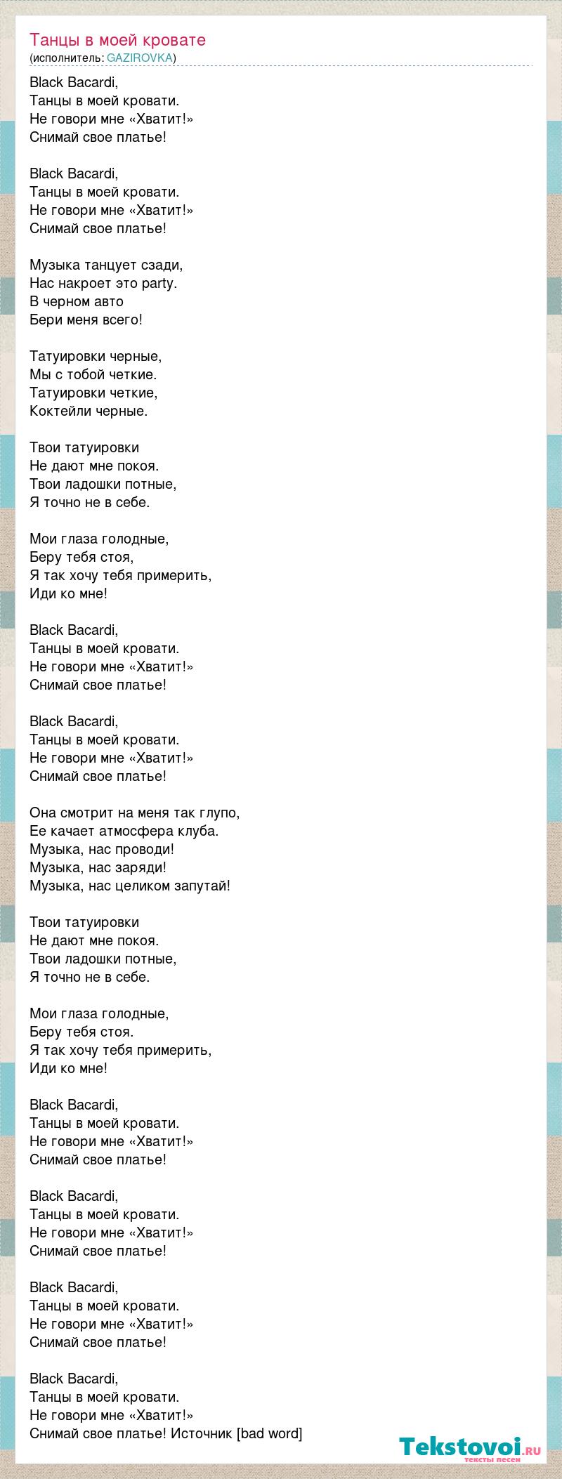 Black Bacardi, Танцы в моей кровати. Не говори мне «Хватит!» Снимай свое платье! Black Bacardi, Танцы в моей кровати. Не говори мне «Хватит!» Снимай свое платье! Музыка танцует сзади, Нас накроет это party. В черном авто Бери меня всего! Татуировки черные, Мы с тобой четкие. Татуировки четкие, Коктейли черные. Твои татуировки Не дают мне покоя. Твои ладошки потные, Я точно не в себе. Мои глаза голодные, Беру тебя стоя, Я так хочу тебя примерить, Иди ко мне! Black Bacardi, Танцы в моей кровати. Не говори мне «Хватит!» Снимай свое платье! Black Bacardi, Танцы в моей кровати. Не говори мне «Хватит!» Снимай свое платье! Она смотрит на меня так глупо, Ее качает атмосфера клуба. Музыка, нас проводи! Музыка, нас заряди! Музыка, нас целиком запутай! Твои татуировки Не дают мне покоя. Твои ладошки потные, Я точно не в себе. Мои глаза голодные, Беру тебя стоя. Я так хочу тебя примерить, Иди ко мне! Black Bacardi, Танцы в моей кровати. Не говори мне «Хватит!» Снимай свое платье! Black Bacardi, Танцы в моей кровати. Не говори мне «Хватит!» Снимай свое платье! Black Bacardi, Танцы в моей кровати. Не говори мне «Хватит!» Снимай свое платье! Black Bacardi, Танцы в моей кровати. Не говори мне «Хватит!» Снимай свое платье! Источник [bad word]