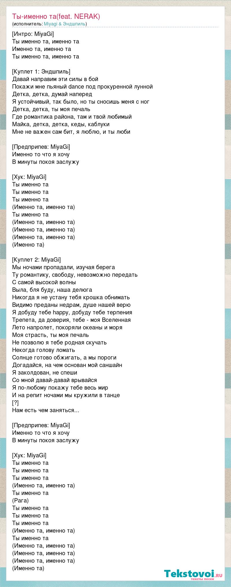 [Интро: MiyaGi] Ты именно та, именно та Именно та, именно та Ты именно та, именно та [Куплет 1: Эндшпиль] Давай направим эти силы в бой Покажи мне пьяный dance под прокуренной лунной Детка, детка, думай наперед Я устойчивый, так было, но ты сносишь меня с ног Детка, детка, ты моя печаль Где романтика района, там и твой любимый Майка, детка, детка, кеды, каблуки Мне не важен сам бит, я люблю, и ты люби [Предприпев: MiyaGi] Именно то что я хочу В минуты покоя заслужу [Хук: MiyaGi] Ты именно та Ты именно та Ты именно та (Именно та, именно та) Ты именно та (Именно та, именно та) (Именно та, именно та) (Именно та, именно та) (Именно та) [Куплет 2: MiyaGi] Мы ночами пропадали, изучая берега Ту романтику, свободу, невозможно передать С самой высокой волны Выла, бля буду, наша делюга Никогда я не устану тебя крошка обнимать Видимо преданы недрам, душе нашей верю Я добуду тебе happy, добуду тебе терпения Трепета, да доверия, тебе - моя Вселенная Лето напролет, покоряли океаны и моря Моя страсть, ты моя печаль Не позволю я тебе родная скучать Некогда голову ломать Солнце готово обжигать, а мы пороги Догадайся, на чем основан мой саншайн Я заколдован, не спеши Со мной давай-давай врывайся Я по-любому покажу тебе весь мир И на репит ночами мы кружили в танце [?] Нам есть чем заняться... [Предприпев: MiyaGi] Именно то что я хочу В минуты покоя заслужу [Хук: MiyaGi] Ты именно та Ты именно та Ты именно та (Именно та, именно та) Ты именно та (Рага) Ты именно та Ты именно та Ты именно та (Именно та, именно та) Ты именно та (Именно та, именно та) (Именно та, именно та) (Именно та, именно та) (Именно та)