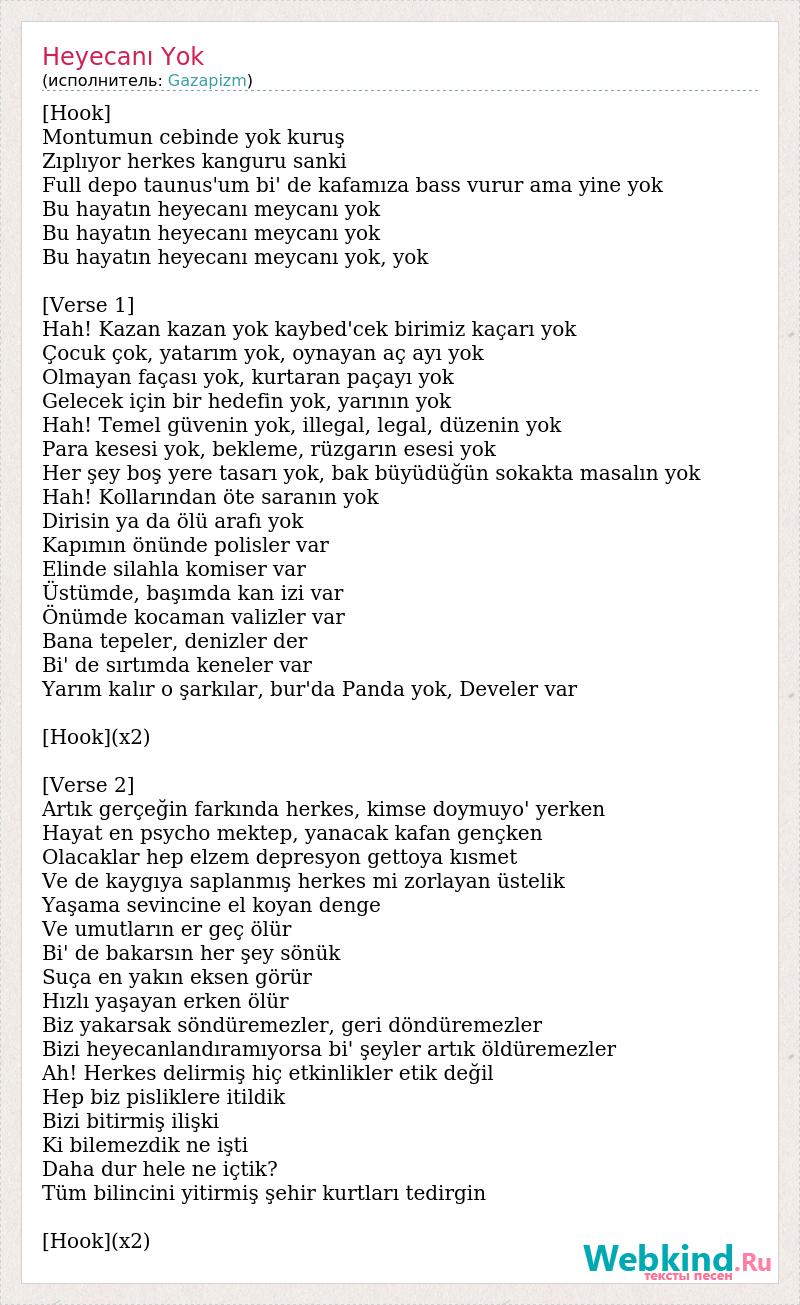 [Hook] Montumun cebinde yok kuruş Zıplıyor herkes kanguru sanki Full depo taunus'um bi' de kafamıza bass vurur ama yine yok Bu hayatın heyecanı meycanı yok Bu hayatın heyecanı meycanı yok Bu hayatın heyecanı meycanı yok, yok [Verse 1] Hah! Kazan kazan yok kaybed'cek birimiz kaçarı yok Çocuk çok, yatarım yok, oynayan aç ayı yok Olmayan façası yok, kurtaran paçayı yok Gelecek için bir hedefin yok, yarının yok Hah! Temel güvenin yok, illegal, legal, düzenin yok Para kesesi yok, bekleme, rüzgarın esesi yok Her şey boş yere tasarı yok, bak büyüdüğün sokakta masalın yok Hah! Kollarından öte saranın yok Dirisin ya da ölü arafı yok Kapımın önünde polisler var Elinde silahla komiser var Üstümde, başımda kan izi var Önümde kocaman valizler var Bana tepeler, denizler der Bi' de sırtımda keneler var Yarım kalır o şarkılar, bur'da Panda yok, Develer var [Hook](x2) [Verse 2] Artık gerçeğin farkında herkes, kimse doymuyo' yerken Hayat en psycho mektep, yanacak kafan gençken Olacaklar hep elzem depresyon gettoya kısmet Ve de kaygıya saplanmış herkes mi zorlayan üstelik Yaşama sevincine el koyan denge Ve umutların er geç ölür Bi' de bakarsın her şey sönük Suça en yakın eksen görür Hızlı yaşayan erken ölür Biz yakarsak söndüremezler, geri döndüremezler Bizi heyecanlandıramıyorsa bi' şeyler artık öldüremezler Ah! Herkes delirmiş hiç etkinlikler etik değil Hep biz pisliklere itildik Bizi bitirmiş ilişki Ki bilemezdik ne işti Daha dur hele ne içtik? Tüm bilincini yitirmiş şehir kurtları tedirgin [Hook](x2)