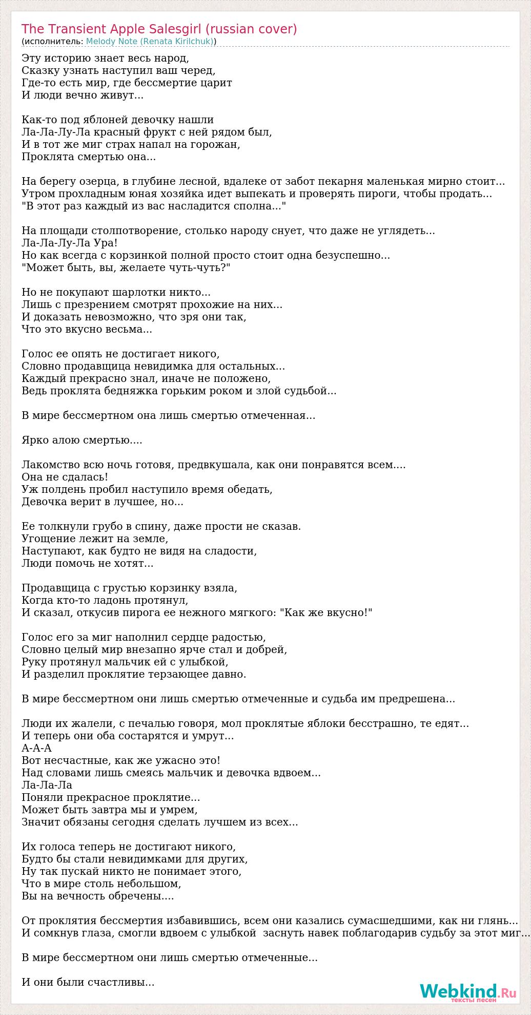 Эту историю знает весь народ, Сказку узнать наступил ваш черед, Где-то есть мир, где бессмертие царит И люди вечно живут... Как-то под яблоней девочку нашли Ла-Ла-Лу-Ла красный фрукт с ней рядом был, И в тот же миг страх напал на горожан, Проклята смертью она... На берегу озерца, в глубине лесной, вдалеке от забот пекарня маленькая мирно стоит... Утром прохладным юная хозяйка идет выпекать и проверять пироги, чтобы продать... "В этот раз каждый из вас насладится сполна..." На площади столпотворение, столько народу снует, что даже не углядеть... Ла-Ла-Лу-Ла Ура! Но как всегда с корзинкой полной просто стоит одна безуспешно... "Может быть, вы, желаете чуть-чуть?" Но не покупают шарлотки никто... Лишь с презрением смотрят прохожие на них... И доказать невозможно, что зря они так, Что это вкусно весьма... Голос ее опять не достигает никого, Словно продавщица невидимка для остальных... Каждый прекрасно знал, иначе не положено, Ведь проклята бедняжка горьким роком и злой судьбой... В мире бессмертном она лишь смертью отмеченная... Ярко алою смертью.... Лакомство всю ночь готовя, предвкушала, как они понравятся всем.... Она не сдалась! Уж полдень пробил наступило время обедать, Девочка верит в лучшее, но... Ее толкнули грубо в спину, даже прости не сказав. Угощение лежит на земле, Наступают, как будто не видя на сладости, Люди помочь не хотят... Продавщица с грустью корзинку взяла, Когда кто-то ладонь протянул, И сказал, откусив пирога ее нежного мягкого: "Как же вкусно!" Голос его за миг наполнил сердце радостью, Словно целый мир внезапно ярче стал и добрей, Руку протянул мальчик ей с улыбкой, И разделил проклятие терзающее давно. В мире бессмертном они лишь смертью отмеченные и судьба им предрешена... Люди их жалели, с печалью говоря, мол проклятые яблоки бесстрашно, те едят... И теперь они оба состарятся и умрут... А-А-А Вот несчастные, как же ужасно это! Над словами лишь смеясь мальчик и девочка вдвоем... Ла-Ла-Ла Поняли прекрасное проклятие... Может быть завтра мы и умрем, Значит обязаны сегодня сделать лучшем из всех... Их голоса теперь не достигают никого, Будто бы стали невидимками для других, Ну так пускай никто не понимает этого, Что в мире столь небольшом, Вы на вечность обречены.... От проклятия бессмертия избавившись, всем они казались сумасшедшими, как ни глянь... И сомкнув глаза, смогли вдвоем с улыбкой заснуть навек поблагодарив судьбу за этот миг... В мире бессмертном они лишь смертью отмеченные... И они были счастливы...