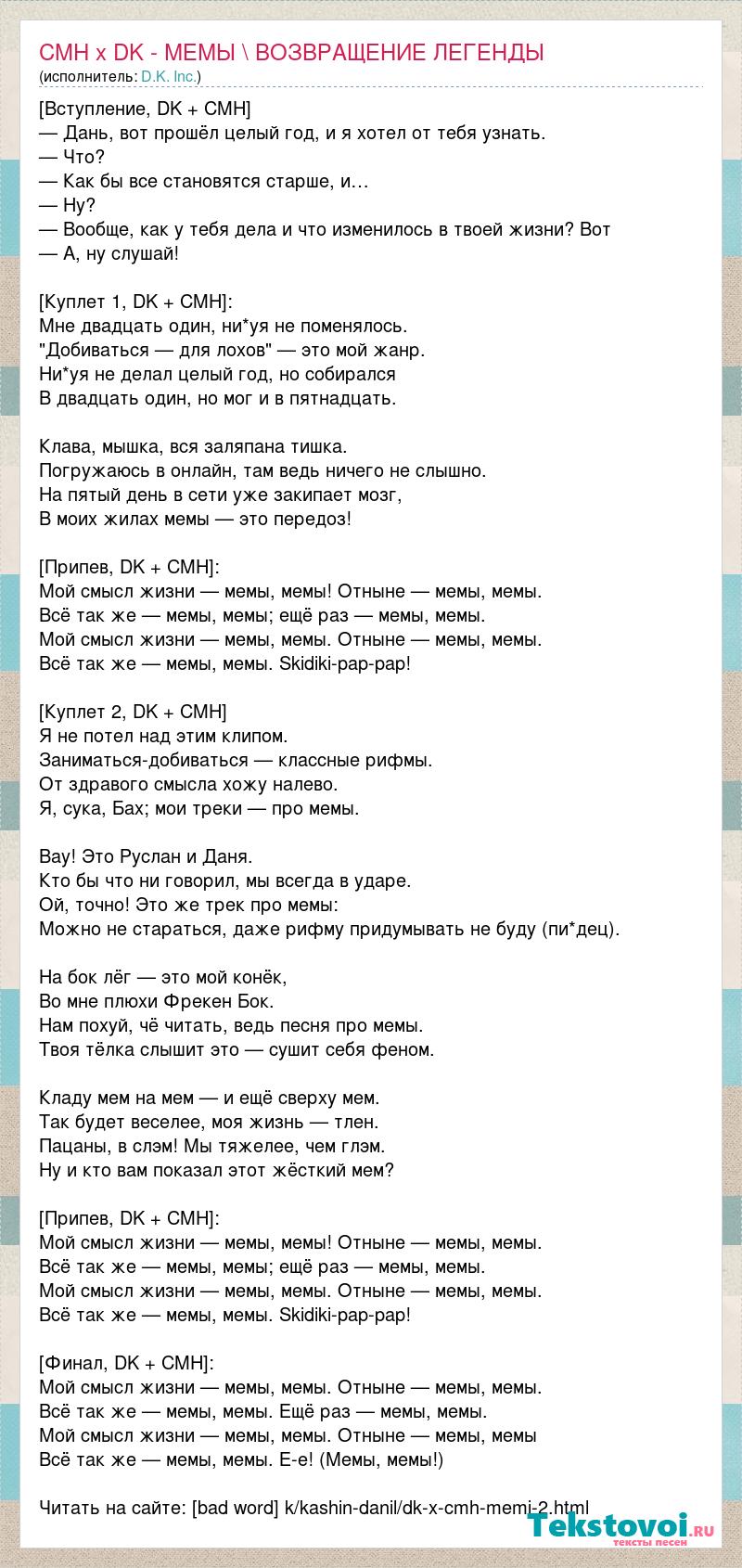 [Вступление, DK + CMH] — Дань, вот прошёл целый год, и я хотел от тебя узнать. — Что? — Как бы все становятся старше, и… — Ну? — Вообще, как у тебя дела и что изменилось в твоей жизни? Вот — А, ну слушай! [Куплет 1, DK + CMH]: Мне двадцать один, ни*уя не поменялось. "Добиваться — для лохов" — это мой жанр. Ни*уя не делал целый год, но собирался В двадцать один, но мог и в пятнадцать. Клава, мышка, вся заляпана тишка. Погружаюсь в онлайн, там ведь ничего не слышно. На пятый день в сети уже закипает мозг, В моих жилах мемы — это передоз! [Припев, DK + CMH]: Мой смысл жизни — мемы, мемы! Отныне — мемы, мемы. Всё так же — мемы, мемы; ещё раз — мемы, мемы. Мой смысл жизни — мемы, мемы. Отныне — мемы, мемы. Всё так же — мемы, мемы. Skidiki-pap-pap! [Куплет 2, DK + CMH] Я не потел над этим клипом. Заниматься-добиваться — классные рифмы. От здравого смысла хожу налево. Я, сука, Бах; мои треки — про мемы. Вау! Это Руслан и Даня. Кто бы что ни говорил, мы всегда в ударе. Ой, точно! Это же трек про мемы: Можно не стараться, даже рифму придумывать не буду (пи*дец). На бок лёг — это мой конёк, Во мне плюхи Фрекен Бок. Нам похуй, чё читать, ведь песня про мемы. Твоя тёлка слышит это — сушит себя феном. Кладу мем на мем — и ещё сверху мем. Так будет веселее, моя жизнь — тлен. Пацаны, в слэм! Мы тяжелее, чем глэм. Ну и кто вам показал этот жёсткий мем? [Припев, DK + CMH]: Мой смысл жизни — мемы, мемы! Отныне — мемы, мемы. Всё так же — мемы, мемы; ещё раз — мемы, мемы. Мой смысл жизни — мемы, мемы. Отныне — мемы, мемы. Всё так же — мемы, мемы. Skidiki-pap-pap! [Финал, DK + CMH]: Мой смысл жизни — мемы, мемы. Отныне — мемы, мемы. Всё так же — мемы, мемы. Ещё раз — мемы, мемы. Мой смысл жизни — мемы, мемы. Отныне — мемы, мемы Всё так же — мемы, мемы. Е-е! (Мемы, мемы!) Читать на сайте: [bad word] k/kashin-danil/dk-x-cmh-memi-2.html