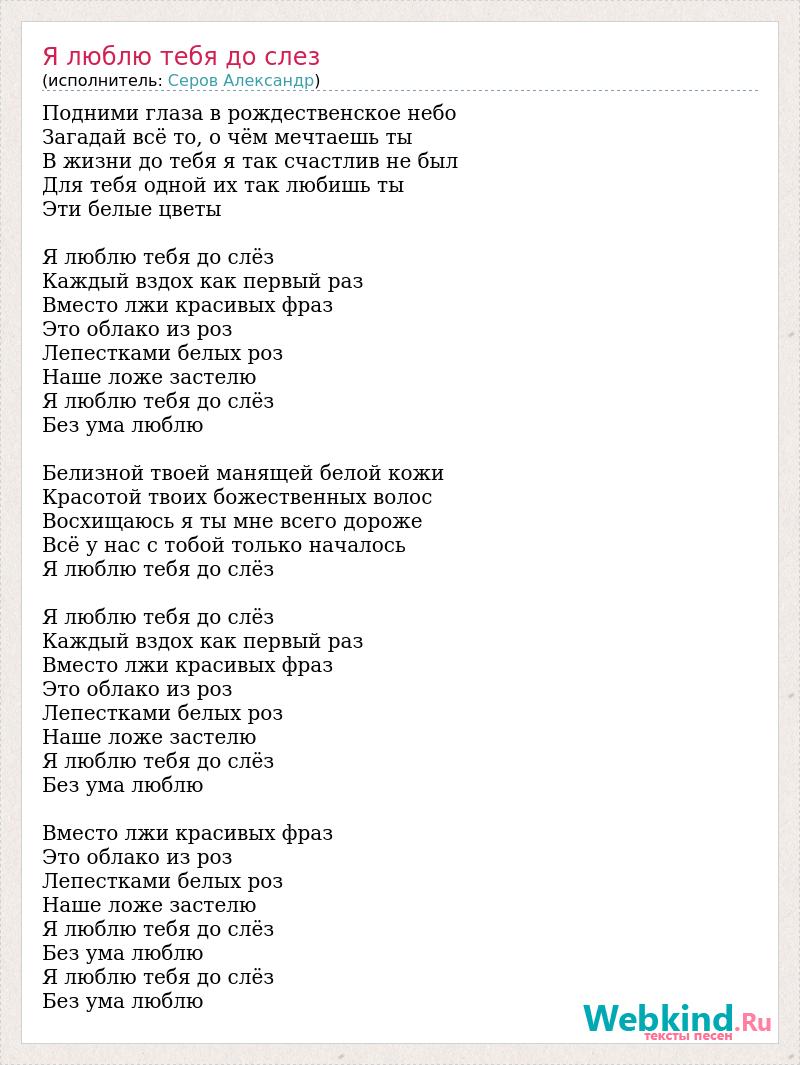 Подними глаза в рождественское небо Загадай всё то, о чём мечтаешь ты В жизни до тебя я так счастлив не был Для тебя одной их так любишь ты Эти белые цветы Я люблю тебя до слёз Каждый вздох как первый раз Вместо лжи красивых фраз Это облако из роз Лепестками белых роз Наше ложе застелю Я люблю тебя до слёз Без ума люблю Белизной твоей манящей белой кожи Красотой твоих божественных волос Восхищаюсь я ты мне всего дороже Всё у нас с тобой только началось Я люблю тебя до слёз Я люблю тебя до слёз Каждый вздох как первый раз Вместо лжи красивых фраз Это облако из роз Лепестками белых роз Наше ложе застелю Я люблю тебя до слёз Без ума люблю Вместо лжи красивых фраз Это облако из роз Лепестками белых роз Наше ложе застелю Я люблю тебя до слёз Без ума люблю Я люблю тебя до слёз Без ума люблю