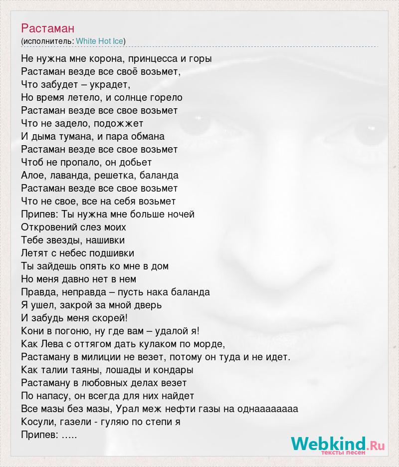 Не нужна мне корона, принцесса и горы Растаман везде все своё возьмет, Что забудет – украдет, Но время летело, и солнце горело Растаман везде все свое возьмет Что не задело, подожжет И дыма тумана, и пара обмана Растаман везде все свое возьмет Чтоб не пропало, он добьет Алое, лаванда, решетка, баланда Растаман везде все свое возьмет Что не свое, все на себя возьмет Припев: Ты нужна мне больше ночей Откровений слез моих Тебе звезды, нашивки Летят с небес подшивки Ты зайдешь опять ко мне в дом Но меня давно нет в нем Правда, неправда – пусть нака баланда Я ушел, закрой за мной дверь И забудь меня скорей! Кони в погоню, ну где вам – удалой я! Как Лева с оттягом дать кулаком по морде, Растаману в милиции не везет, потому он туда и не идет. Как талии таяны, лошады и кондары Растаману в любовных делах везет По напасу, он всегда для них найдет Все мазы без мазы, Урал меж нефти газы на однаааааааа Косули, газели - гуляю по степи я Припев: …..