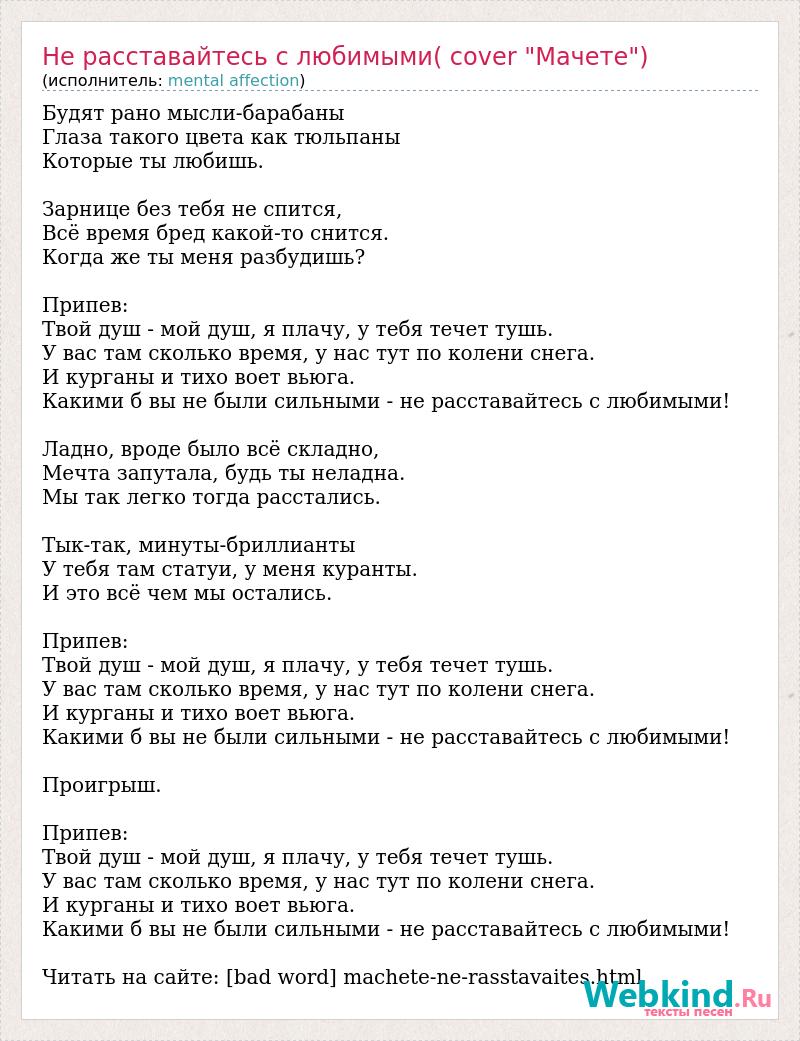 Будят рано мысли-барабаны Глаза такого цвета как тюльпаны Которые ты любишь. Зарнице без тебя не спится, Всё время бред какой-то снится. Когда же ты меня разбудишь? Припев: Твой душ - мой душ, я плачу, у тебя течет тушь. У вас там сколько время, у нас тут по колени снега. И курганы и тихо воет вьюга. Какими б вы не были сильными - не расставайтесь с любимыми! Ладно, вроде было всё складно, Мечта запутала, будь ты неладна. Мы так легко тогда расстались. Тык-так, минуты-бриллианты У тебя там статуи, у меня куранты. И это всё чем мы остались. Припев: Твой душ - мой душ, я плачу, у тебя течет тушь. У вас там сколько время, у нас тут по колени снега. И курганы и тихо воет вьюга. Какими б вы не были сильными - не расставайтесь с любимыми! Проигрыш. Припев: Твой душ - мой душ, я плачу, у тебя течет тушь. У вас там сколько время, у нас тут по колени снега. И курганы и тихо воет вьюга. Какими б вы не были сильными - не расставайтесь с любимыми! Читать на сайте: [bad word] machete-ne-rasstavaites.html
