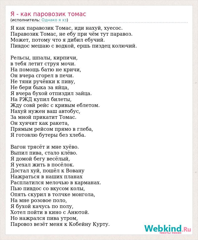 Я как паравозик Томас, иди нахуй, хуесос. Паравозик Томас, не ебу при чём тут паравоз. Может, потому что я дибил ебучий. Пивдос мешаю с водкой, ершь пиздец колючий. Рельсы, шпалы, кирпичи, в тебя летит струя мочи. На помощь батю не кричи, Он вчера сгорел в печи. Не тяни ручёнки к пиву, Не бери быка за яйца, Я вчера бухой отпиздил зайца. На РЖД купил билеты, Жду совй рейс с кривым еблетом. Нахуй нужен ваш автобус, За мной прикатит Томас. Он хуячит как ракета, Прямым рейсом прямо в глеба, Я готовлю бутеры без хлеба. Вагон трясёт и мне хуёво. Выпил пива, стало клёво. Я домой бегу весёлый, Я уехал жить в посёлок. Достал хуй, пошёл к Вовану Нажраться в наших планах Расплатился мелочью в карманах. Пью пивдос со вкусом колы, Опять скурил в толчке монгола, На мне розовое поло, Я бухой качусь по полу, Хотел пойти в кино с Анютой. Но нажрался пива утром, Паровоз везёт меня к Кобейну Курту.