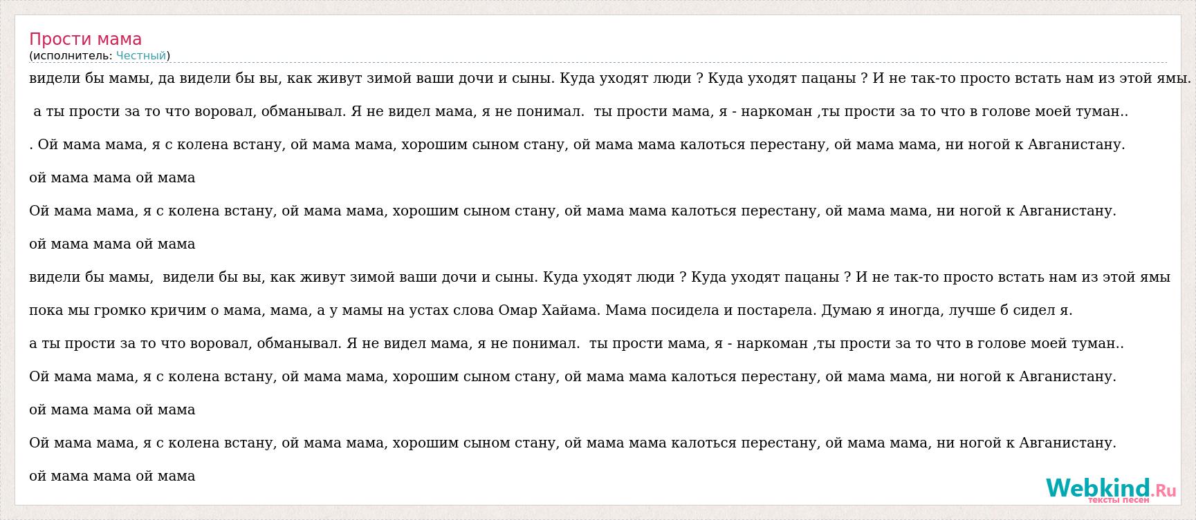 видели бы мамы, да видели бы вы, как живут зимой ваши дочи и сыны. Куда уходят люди ? Куда уходят пацаны ? И не так-то просто встать нам из этой ямы. а ты прости за то что воровал, обманывал. Я не видел мама, я не понимал. ты прости мама, я - наркоман ,ты прости за то что в голове моей туман.. . Ой мама мама, я с колена встану, ой мама мама, хорошим сыном стану, ой мама мама калоться перестану, ой мама мама, ни ногой к Авганистану. ой мама мама ой мама Ой мама мама, я с колена встану, ой мама мама, хорошим сыном стану, ой мама мама калоться перестану, ой мама мама, ни ногой к Авганистану. ой мама мама ой мама видели бы мамы, видели бы вы, как живут зимой ваши дочи и сыны. Куда уходят люди ? Куда уходят пацаны ? И не так-то просто встать нам из этой ямы пока мы громко кричим о мама, мама, а у мамы на устах слова Омар Хайама. Мама посидела и постарела. Думаю я иногда, лучше б сидел я. а ты прости за то что воровал, обманывал. Я не видел мама, я не понимал. ты прости мама, я - наркоман ,ты прости за то что в голове моей туман.. Ой мама мама, я с колена встану, ой мама мама, хорошим сыном стану, ой мама мама калоться перестану, ой мама мама, ни ногой к Авганистану. ой мама мама ой мама Ой мама мама, я с колена встану, ой мама мама, хорошим сыном стану, ой мама мама калоться перестану, ой мама мама, ни ногой к Авганистану. ой мама мама ой мама
