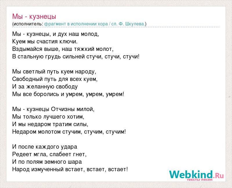Мы - кузнецы, и дух наш молод, Куем мы счастия ключи. Вздымайся выше, наш тяжкий молот, В стальную грудь сильней стучи, стучи, стучи! Мы светлый путь куем народу, Свободный путь для всех куем, И за желанную свободу Мы все боролись и умрем, умрем, умрем! Мы - кузнецы Отчизны милой, Мы только лучшего хотим, И мы недаром тратим силы, Недаром молотом стучим, стучим, стучим! И после каждого удара Редеет мгла, слабеет гнет, И по полям земного шара Народ измученный встает, встает, встает!