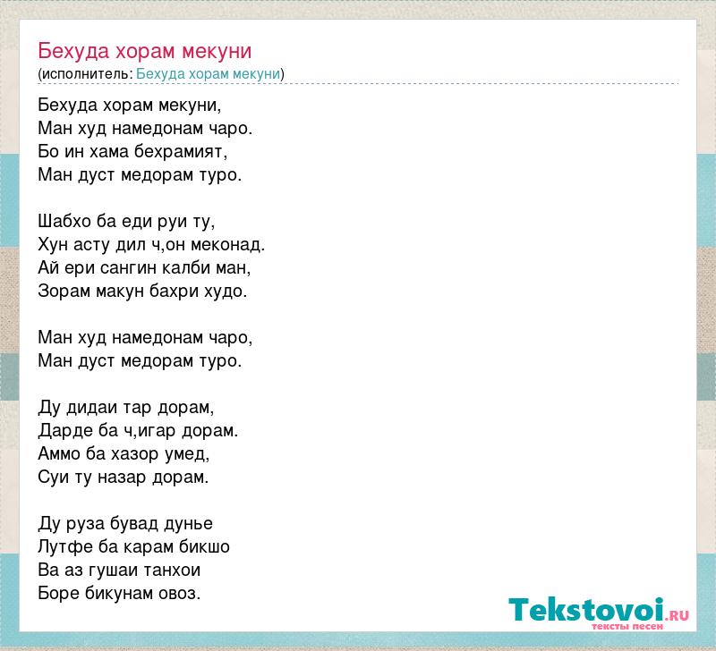 Бехуда хорам мекуни, Ман худ намедонам чаро. Бо ин хама бехрамият, Ман дуст медорам туро. Шабхо ба еди руи ту, Хун асту дил ч,он меконад. Ай ери сангин калби ман, Зорам макун бахри худо. Ман худ намедонам чаро, Ман дуст медорам туро. Ду дидаи тар дорам, Дарде ба ч,игар дорам. Аммо ба хазор умед, Суи ту назар дорам. Ду руза бувад дунье Лутфе ба карам бикшо Ва аз гушаи танхои Боре бикунам овоз.