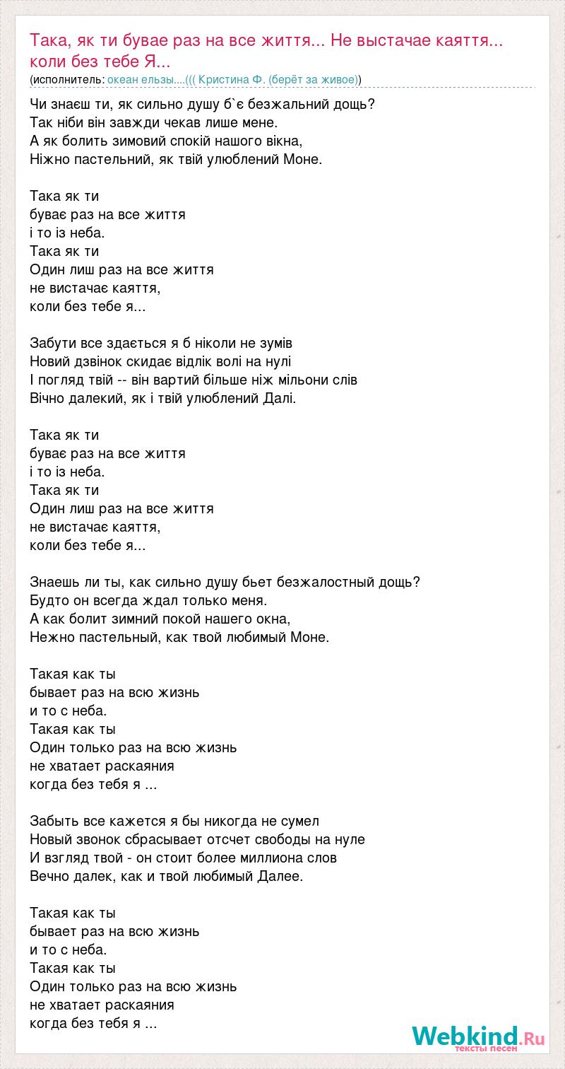 Чи знаєш ти, як сильно душу б`є безжальний дощь? Так ніби він завжди чекав лише мене. А як болить зимовий спокій нашого вікна, Ніжно пастельний, як твій улюблений Моне. Така як ти буває раз на все життя і то із неба. Така як ти Один лиш раз на все життя не вистачає каяття, коли без тебе я... Забути все здається я б ніколи не зумів Новий дзвінок скидає відлік волі на нулі І погляд твій -- він вартий більше ніж мільони слів Вічно далекий, як і твій улюблений Далі. Така як ти буває раз на все життя і то із неба. Така як ти Один лиш раз на все життя не вистачає каяття, коли без тебе я... Знаешь ли ты, как сильно душу бьет безжалостный дощь? Будто он всегда ждал только меня. А как болит зимний покой нашего окна, Нежно пастельный, как твой любимый Моне. Такая как ты бывает раз на всю жизнь и то с неба. Такая как ты Один только раз на всю жизнь не хватает раскаяния когда без тебя я ... Забыть все кажется я бы никогда не сумел Новый звонок сбрасывает отсчет свободы на нуле И взгляд твой - он стоит более миллиона слов Вечно далек, как и твой любимый Далее. Такая как ты бывает раз на всю жизнь и то с неба. Такая как ты Один только раз на всю жизнь не хватает раскаяния когда без тебя я ...